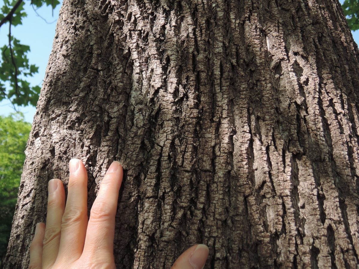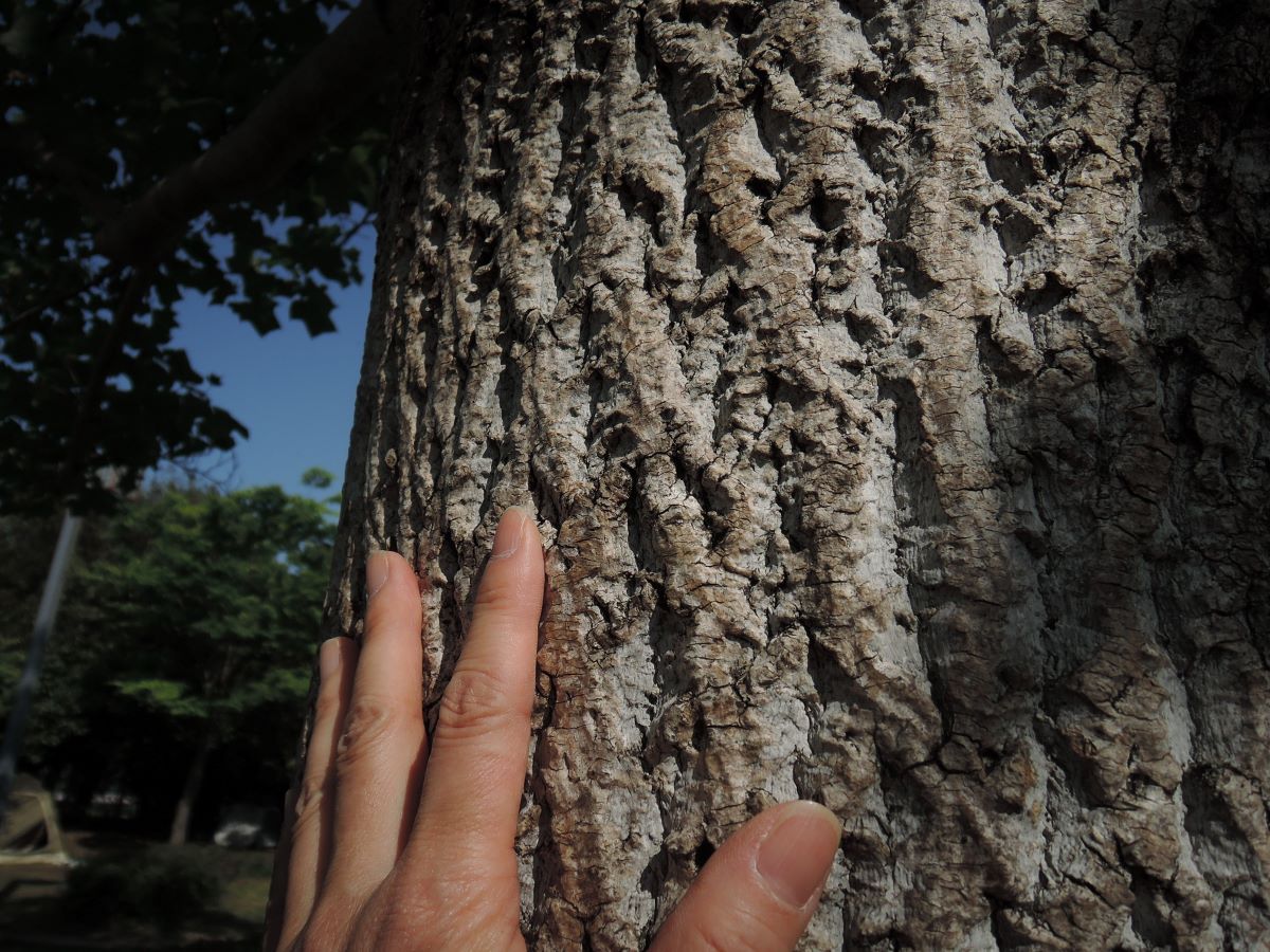 大木の幹肌はシナユリノキっぽい花をつけるものは白っぽく割れ目が浅いのに対しユリノキの樹皮は暗褐色で縦に伸びる深い割れ目が細かくあります。