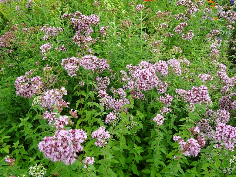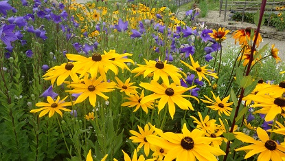 キキョウだけでなく、ケイトウ、オレガノ、ヒマワリのようなルドベキアなど