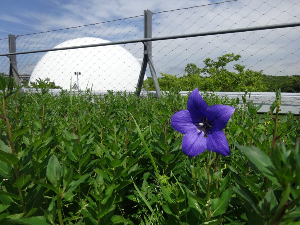 地球市民交流センターの屋上、「キキョウ」が1輪だけ咲き始めていました。