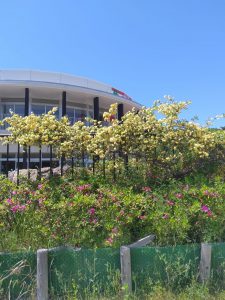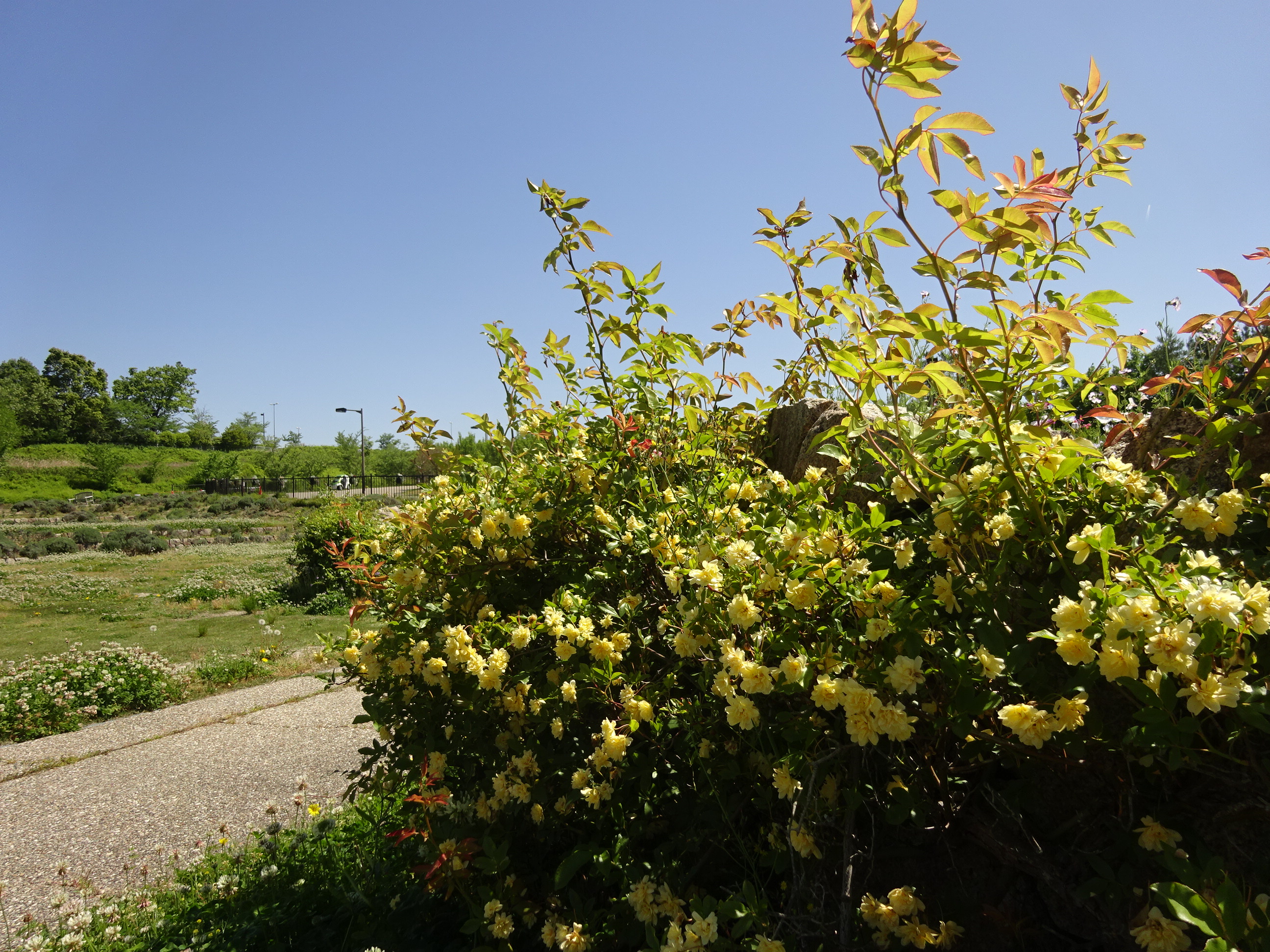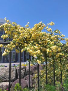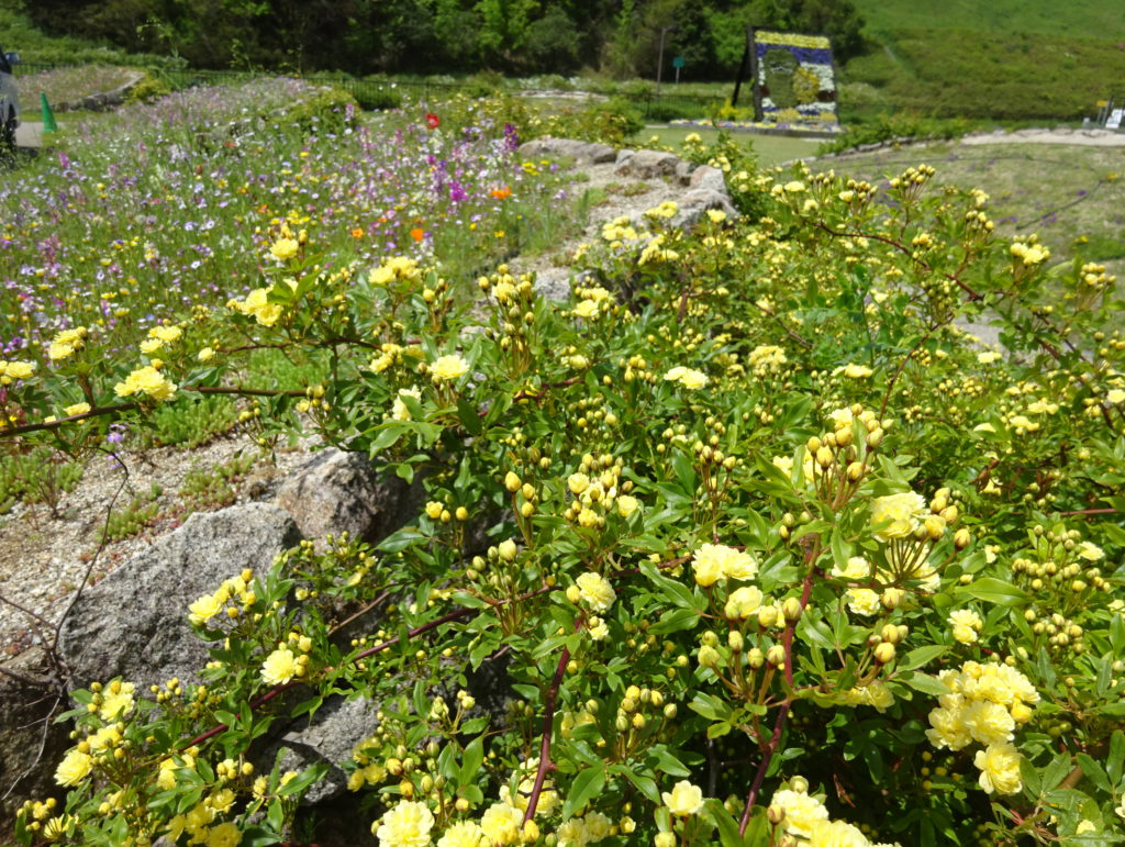 花の広場休憩所の花弁花壇でモッコウバラが咲き始めました。