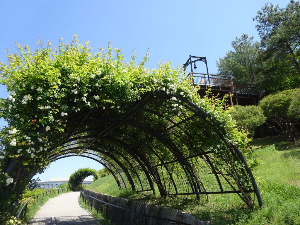 こいの池のほとりのトンネルに溢れるように咲いています。
