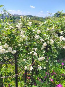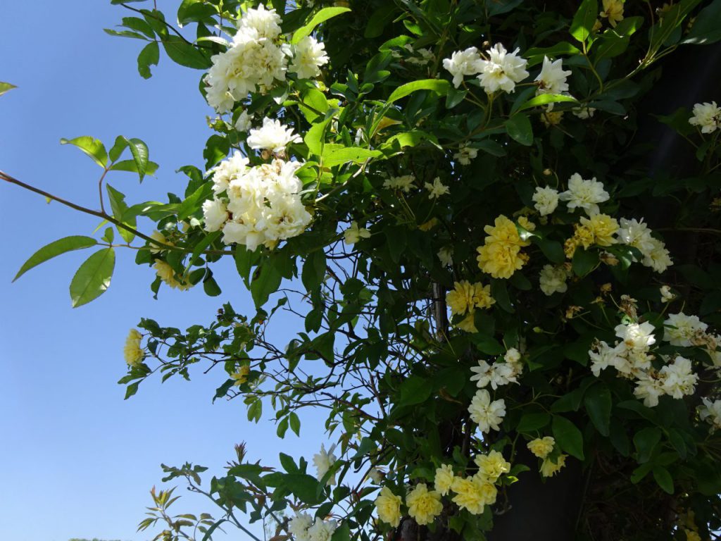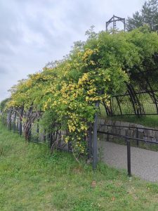 モリコロの鐘のモッコウバラのトンネルです。白と黄色、2種類の花があります。
