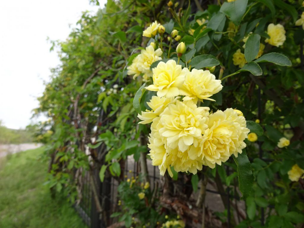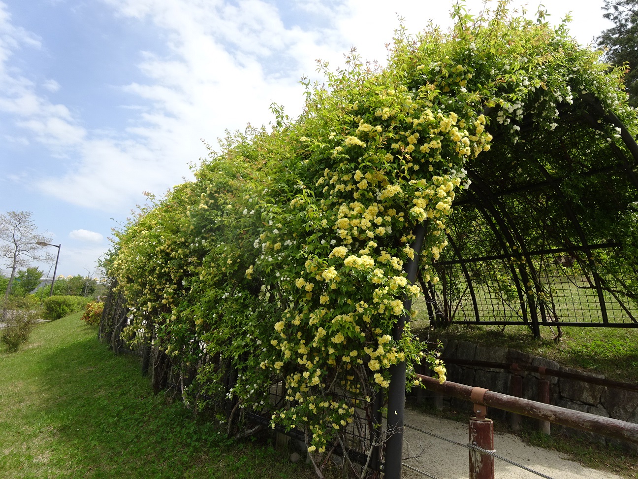 モリコロの鐘のモッコウバラのトンネルです。白と黄色、2種類の花があります。