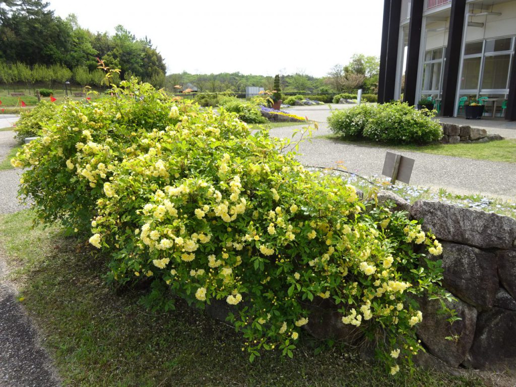 花の広場休憩所の花弁花壇でモッコウバラが咲き始めました。