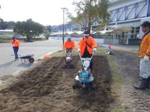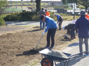 「パナソニック松愛会」の皆様がモリコロエレベーター付近、アイススケート場に続く園路脇で種まきをしてくださいました。