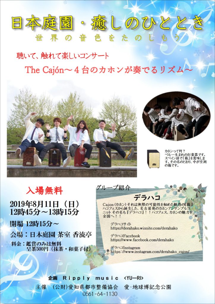 「日本庭園・癒しのひととき The Cajón~4台のカホンが奏でるリズム~」、詳細はこちらからどうぞ。