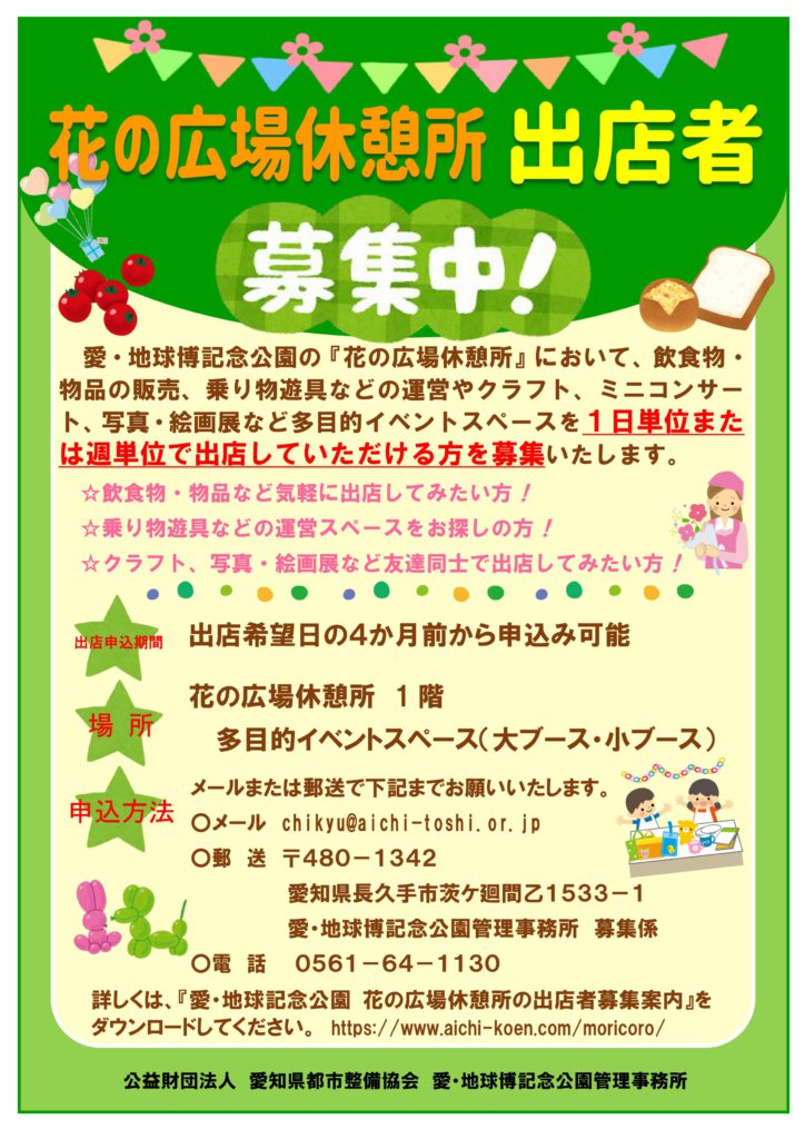 愛・地球博記念公園の『花の広場休憩所』での出店者を募集します。