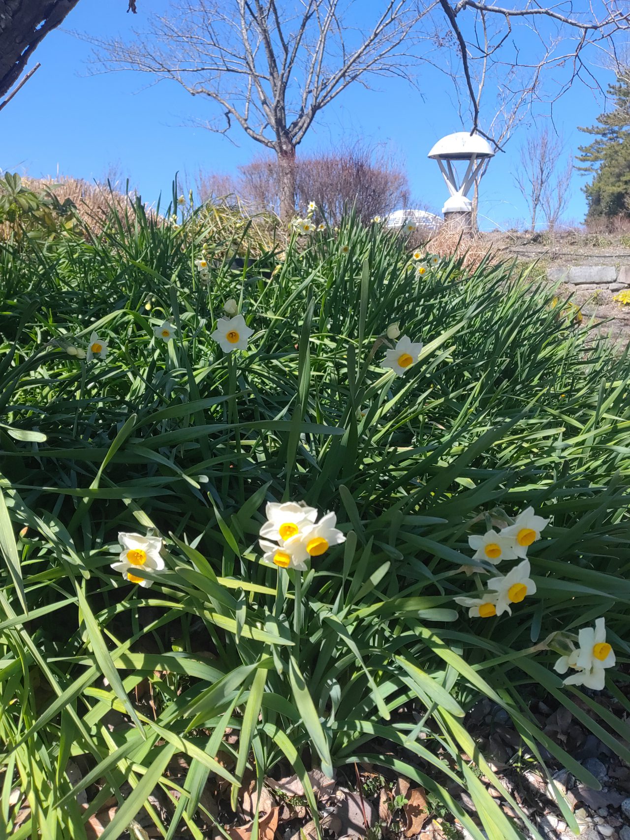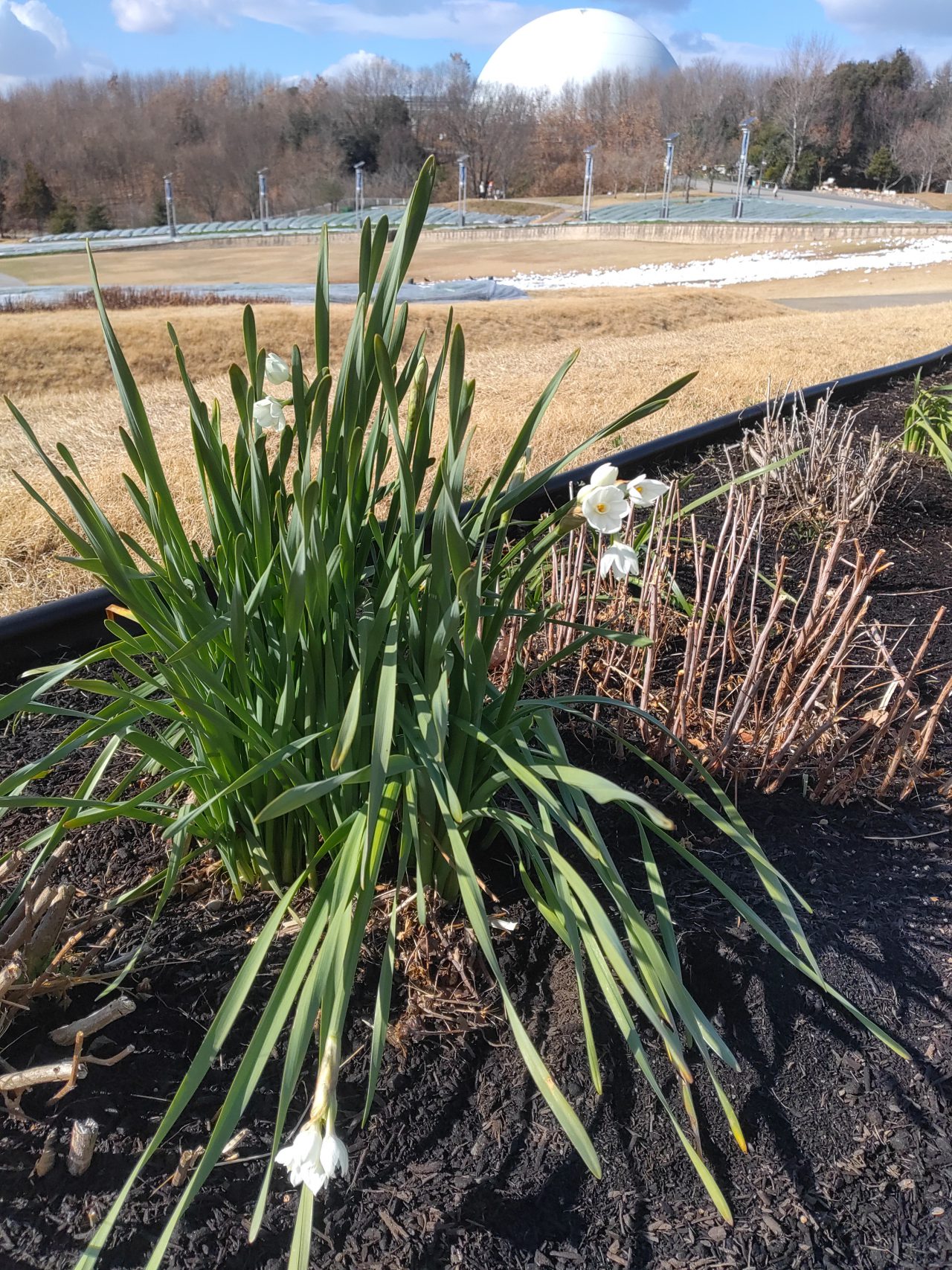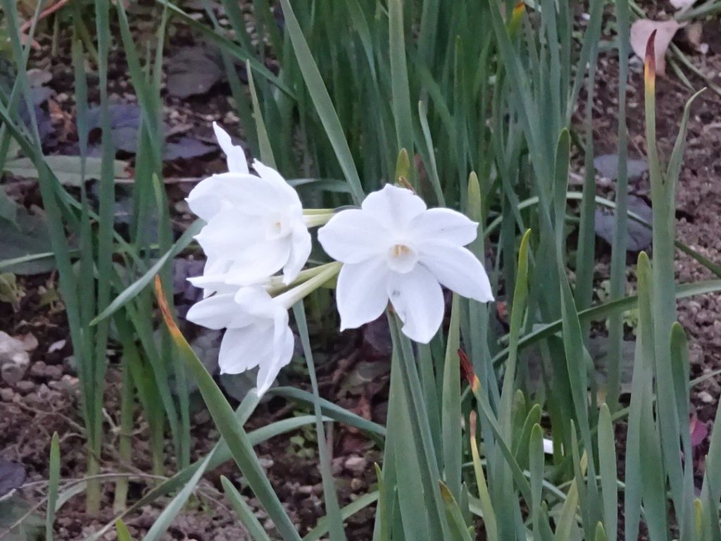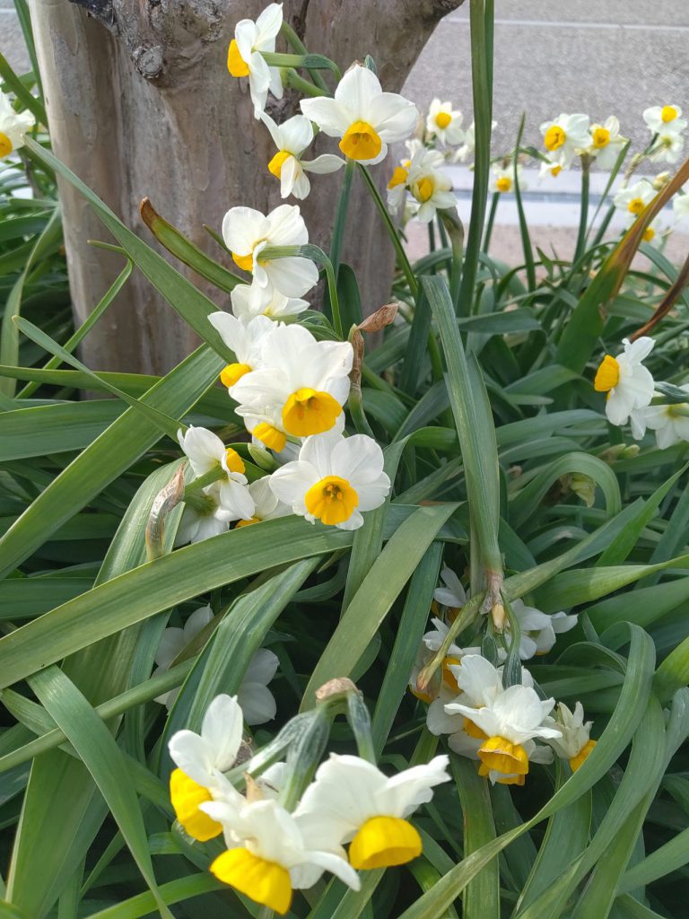 真っ白なスイセンが大花壇で咲きはじめました。