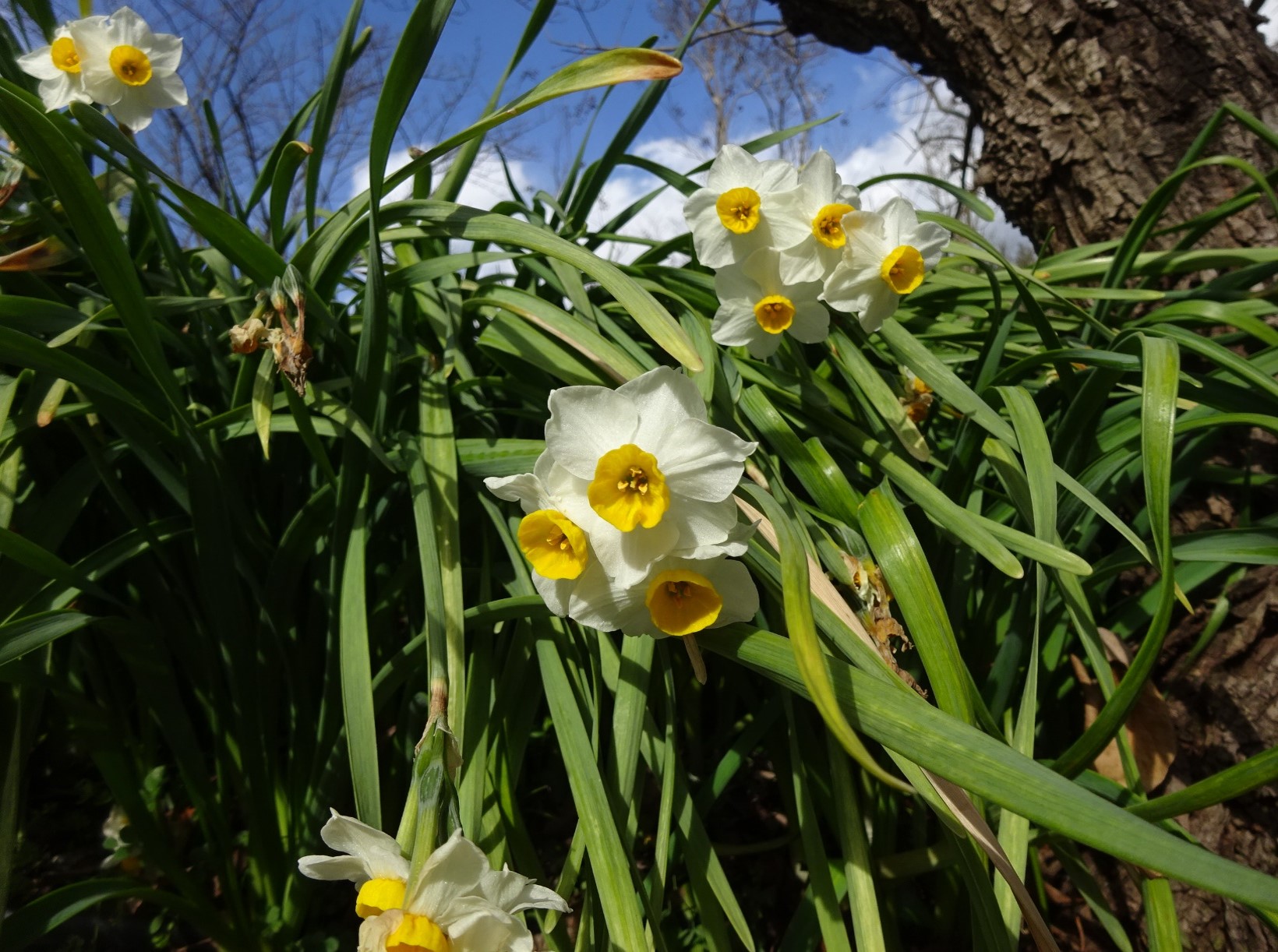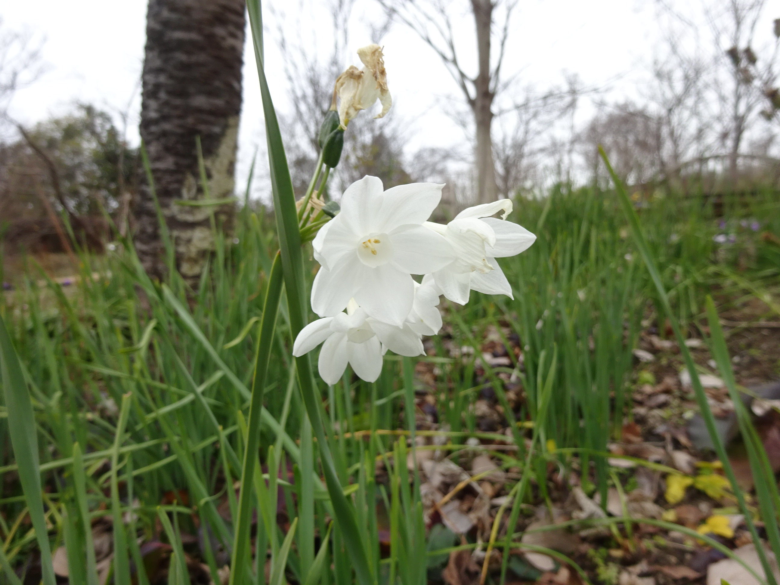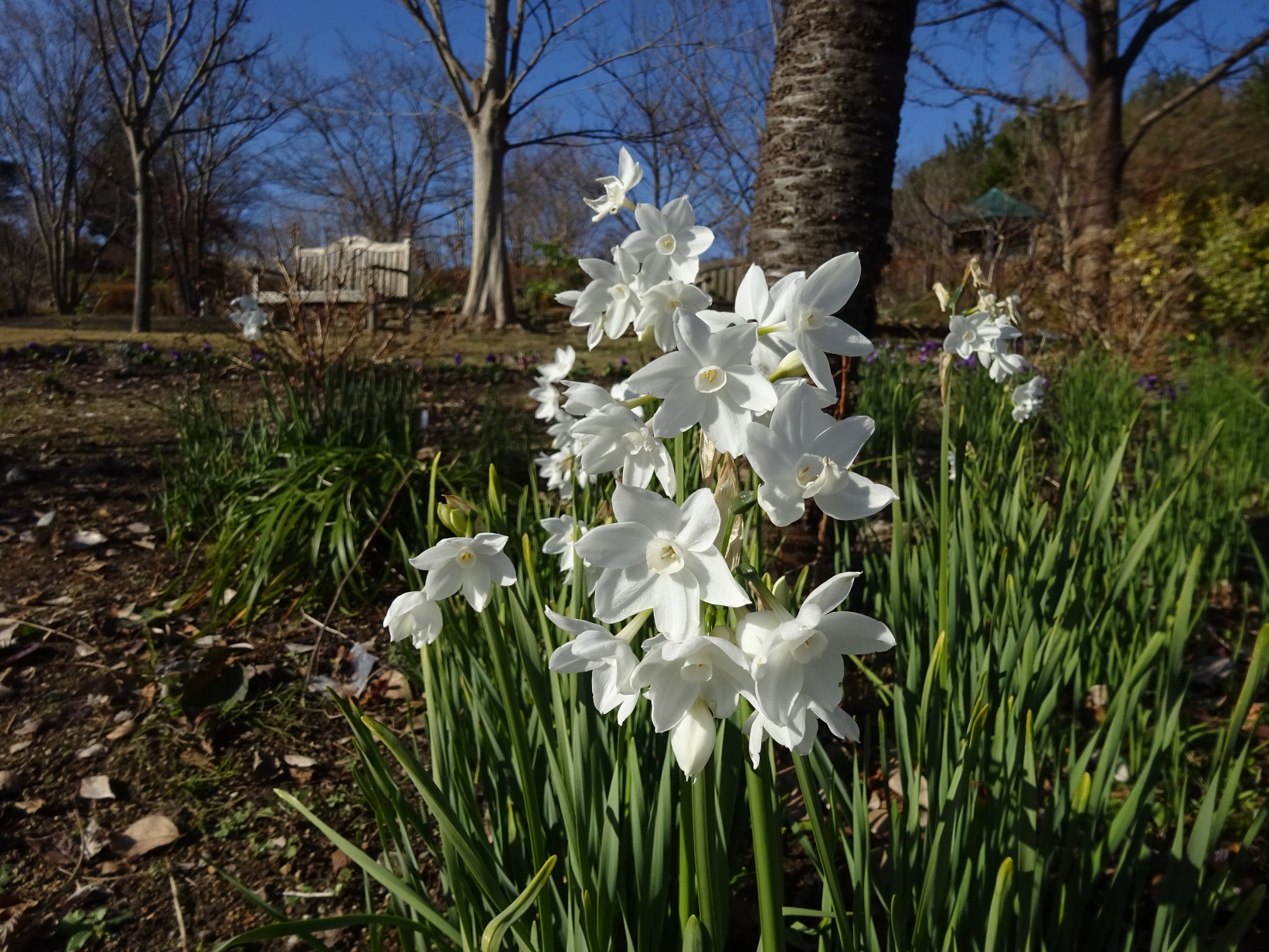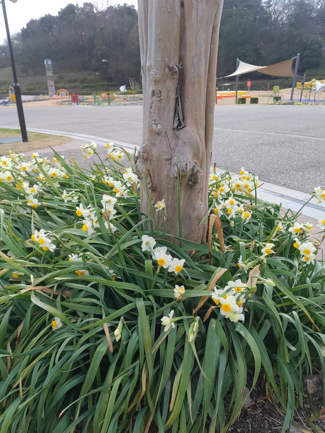 真っ白なスイセンが大花壇で咲きはじめました。