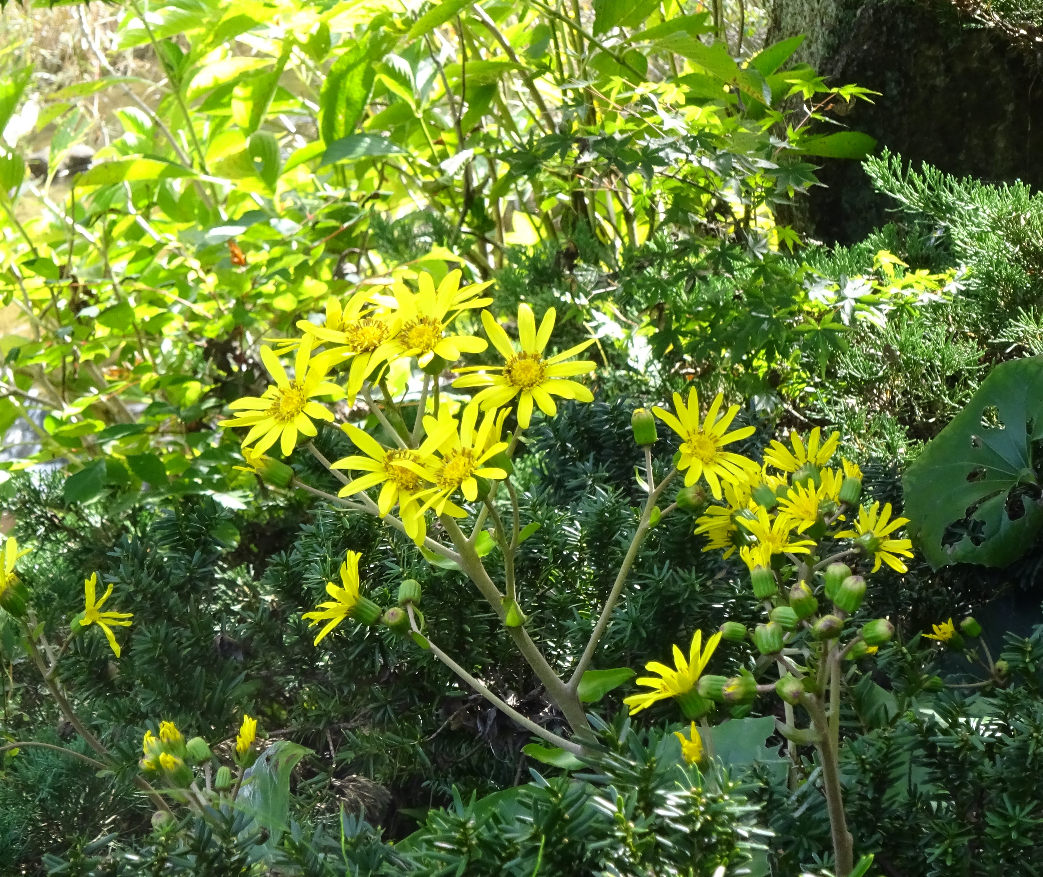 「ツワブキ」が日本庭園となりの「導入の庭」で咲いています。