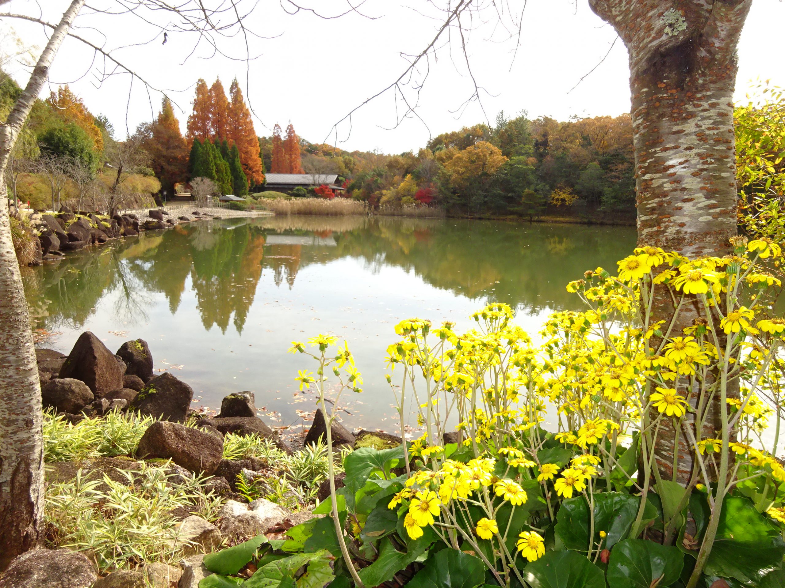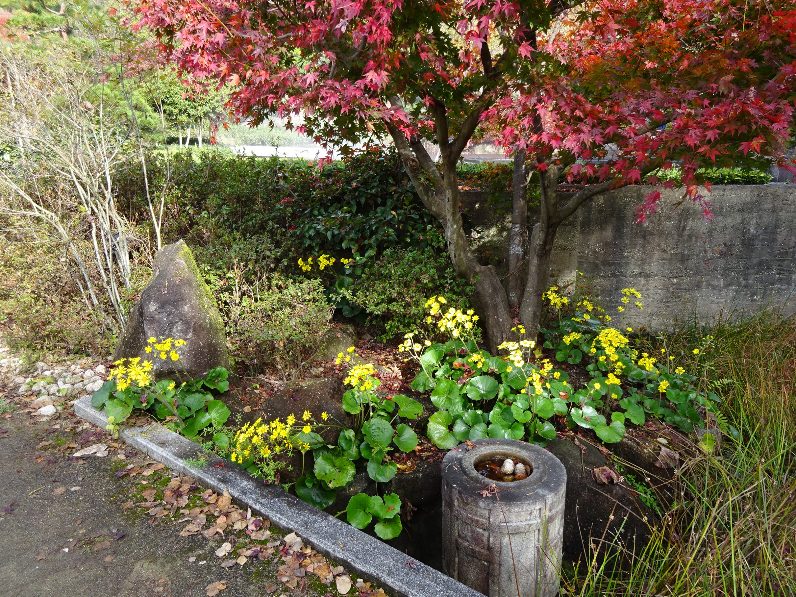 日本庭園のツワブキがきれいに咲いています。紅葉とのコントラストも良いですね。