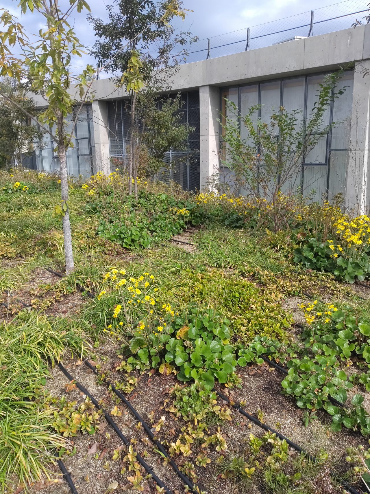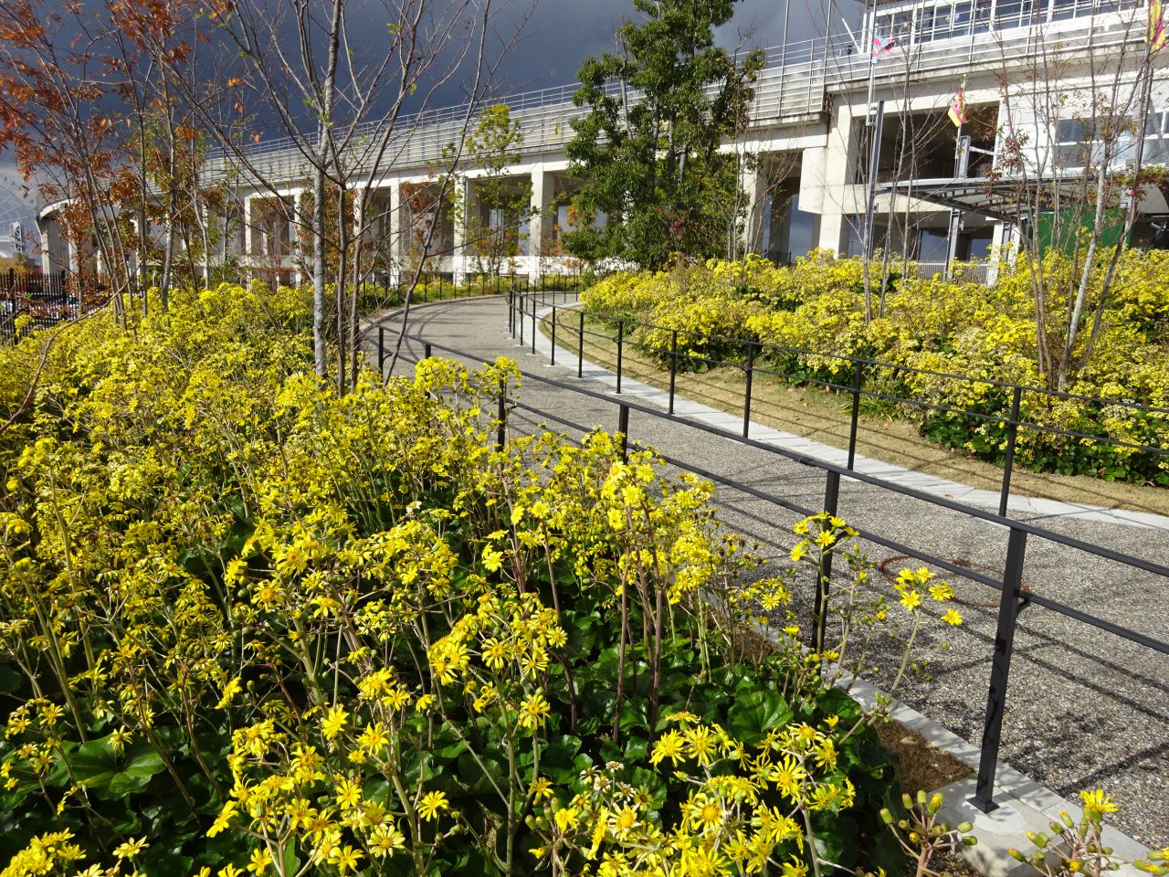 北口エントランスの「ツワブキ」、花の少ない季節に彩を添えてくれます。