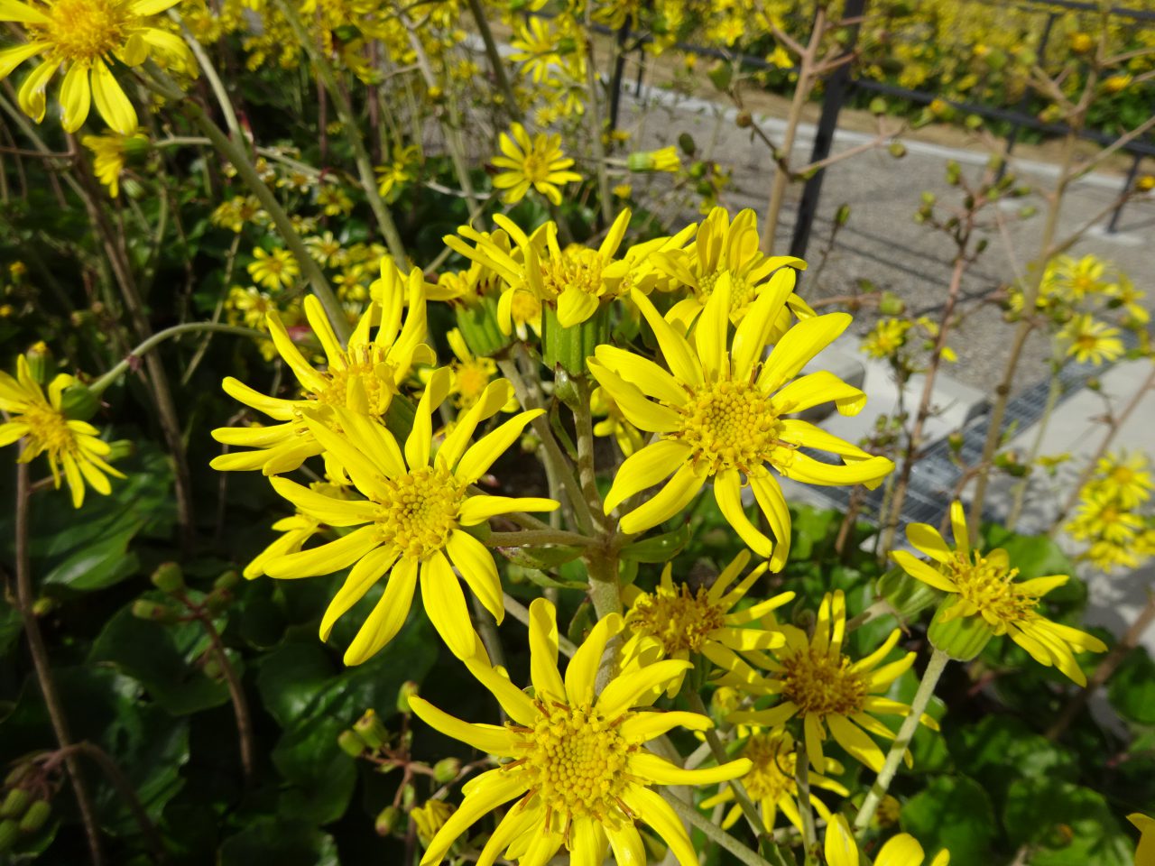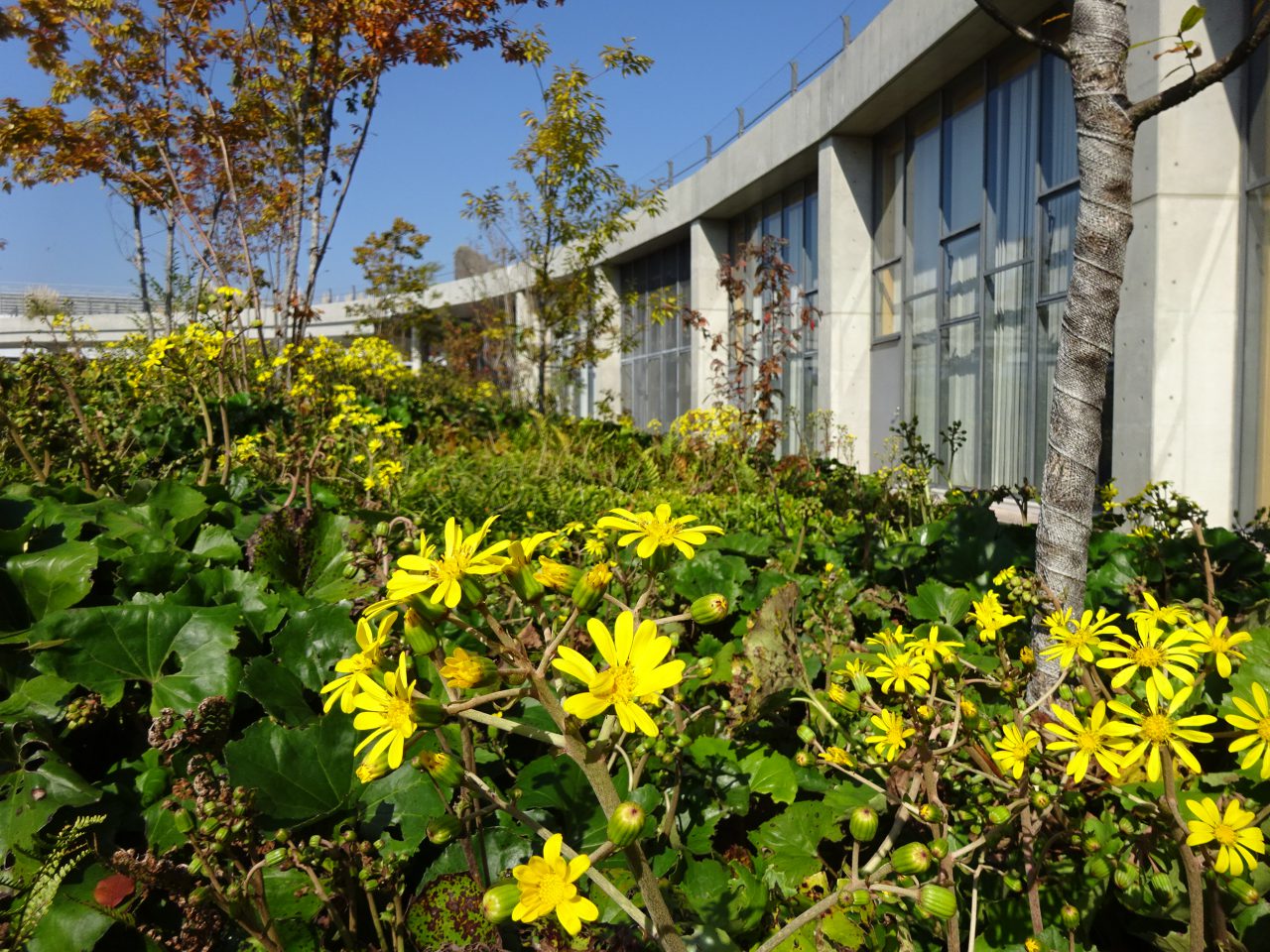 北口エントランスの「ツワブキ」、花の少ない季節に彩を添えてくれます。
