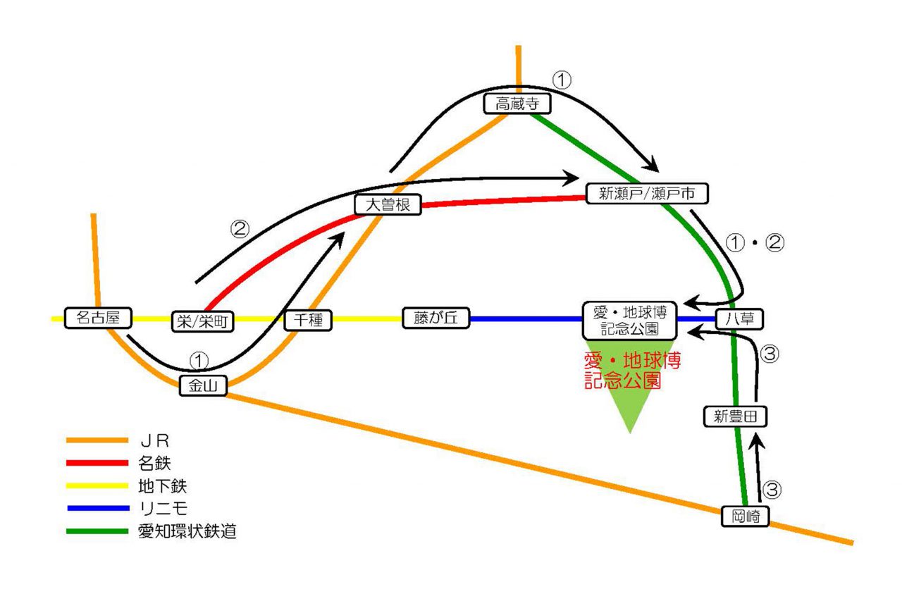 名古屋駅→<JR 中央線>高蔵寺駅→<愛環>八草駅→<リニモ>愛・地球博記念公園駅