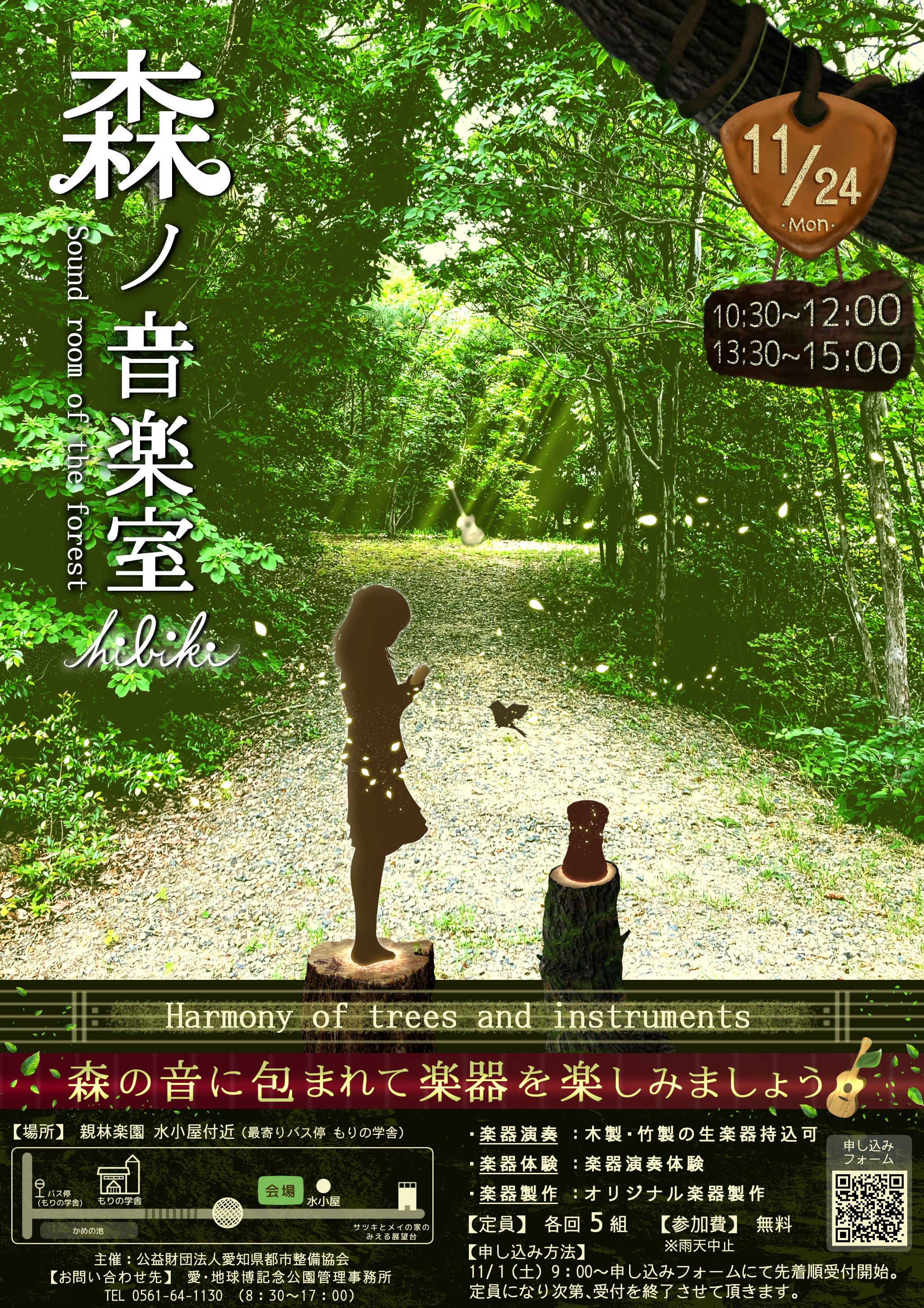 森の音と一体になれる特別なひととき。鳥の声や風を感じ、手作り楽器といろんな楽器の演奏を体験しませんか。