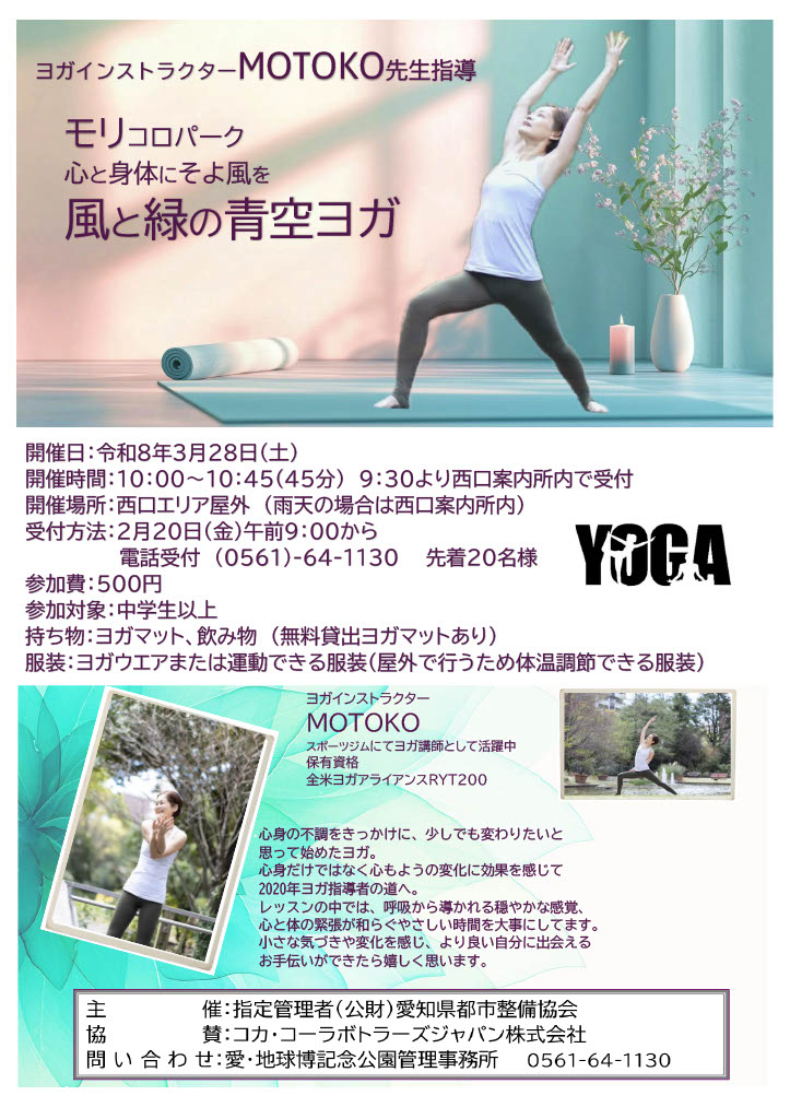 心と身体にそよ風を 風と緑の青空ヨガ 開催日:令和8年3月28日(土) 開催時間:10:00~10:45(45分) 9:30より西口案内所内で受付 開催場所:西口エリア屋外 (雨天の場合は西口案内所内) 受付方法:2月20日(金) 午前9:00から 電話受付 (0561)-64-1130 先着20名様 参加費:500円 参加対象:中学生以上 持ち物:ヨガマット、飲み物 (無料貸出ヨガマットあり) 服装:ヨガウエアまたは運動できる服装 (屋外で行うため体温調節できる服 装)