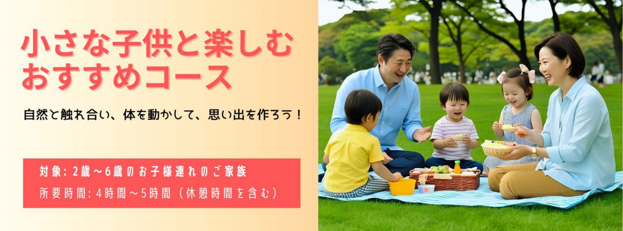 本コースは、2歳から6歳のお子様連れのご家族を対象に、広々とした芝生や遊具、ジブリの世界観を感じられるスポット、そして工作や自然観察など、五感で楽しめる体験をぎゅっと詰め込みました。