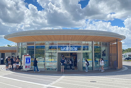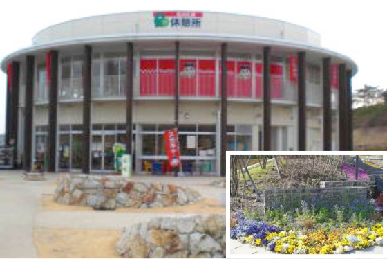 休憩所の周りには、四季を通じて花木や草花を楽しめる空間が。2Fには、飲食にご利用頂ける無料休憩所とスガキヤが入っています。