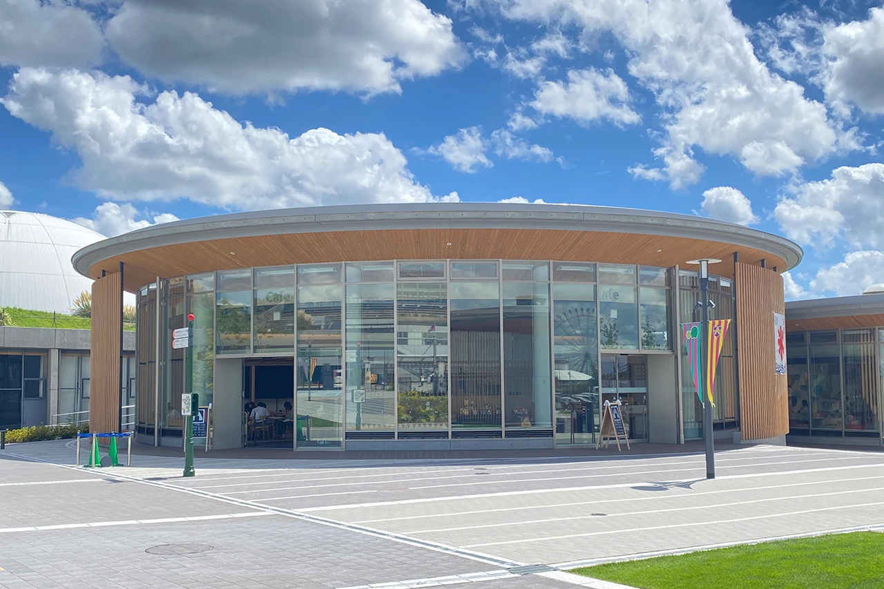 ジブリパークの玄関口となる北口エントランスに、物販・飲食施設「ロタンダ 風ヶ丘(かぜがおか)」があります。