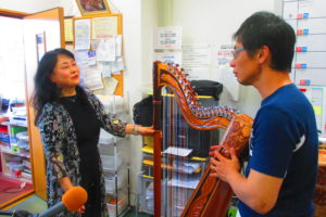 今日はモリコロパークスタッフと一緒にアルパ奏者、大宮陽子さんにも登場していただきました。