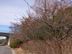 「フィールドセンターもりの学舎」バス停近くにあるカワヅザクラが数輪花を咲かせていました。
