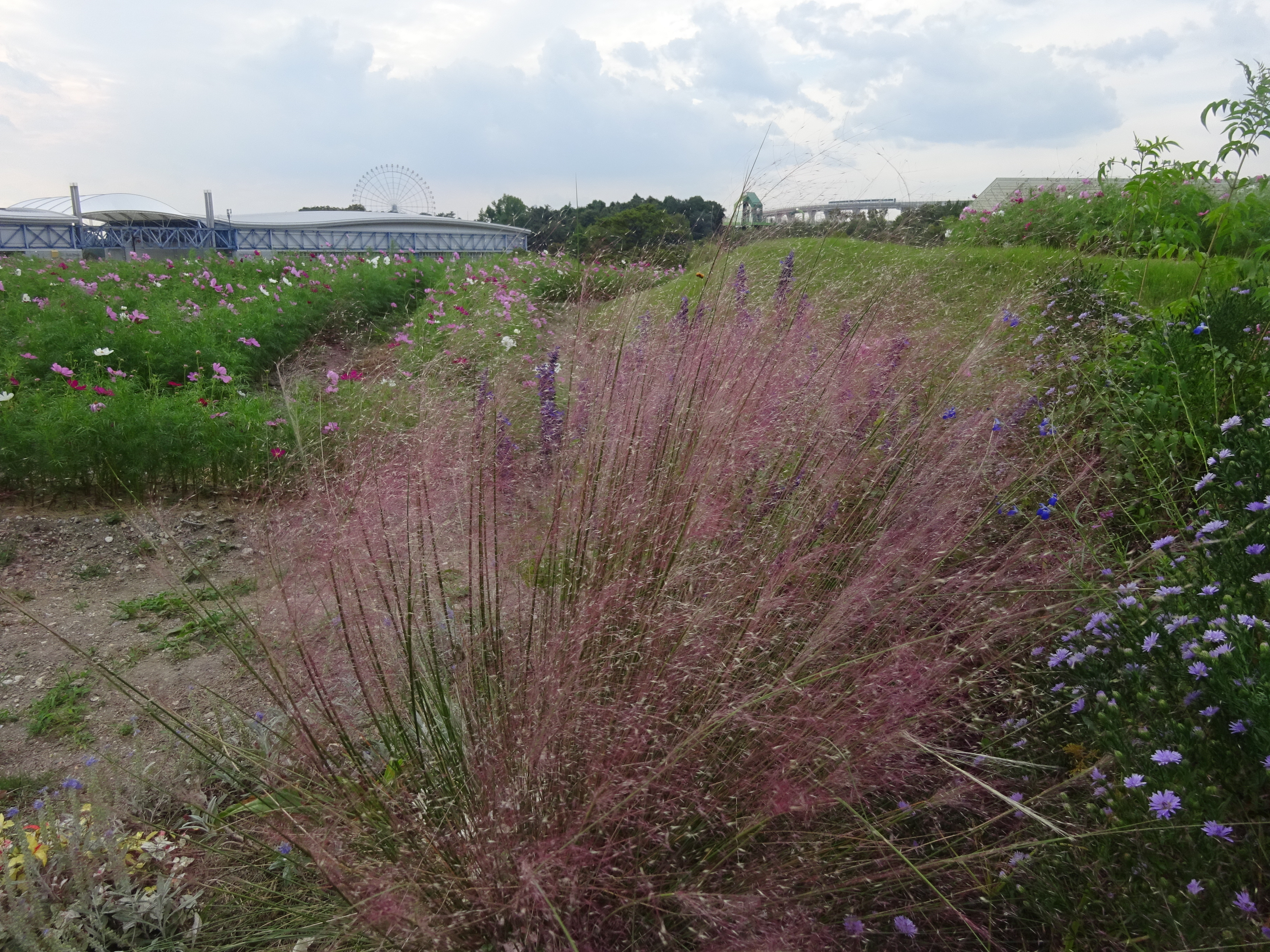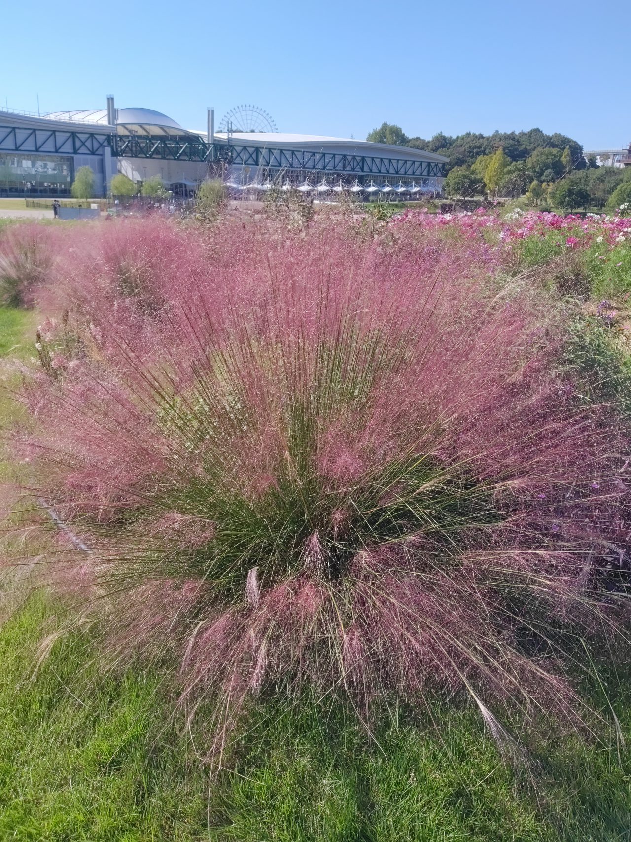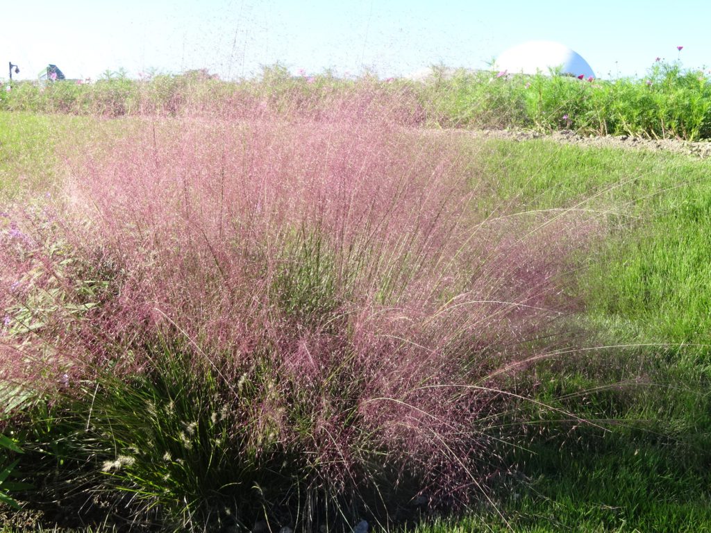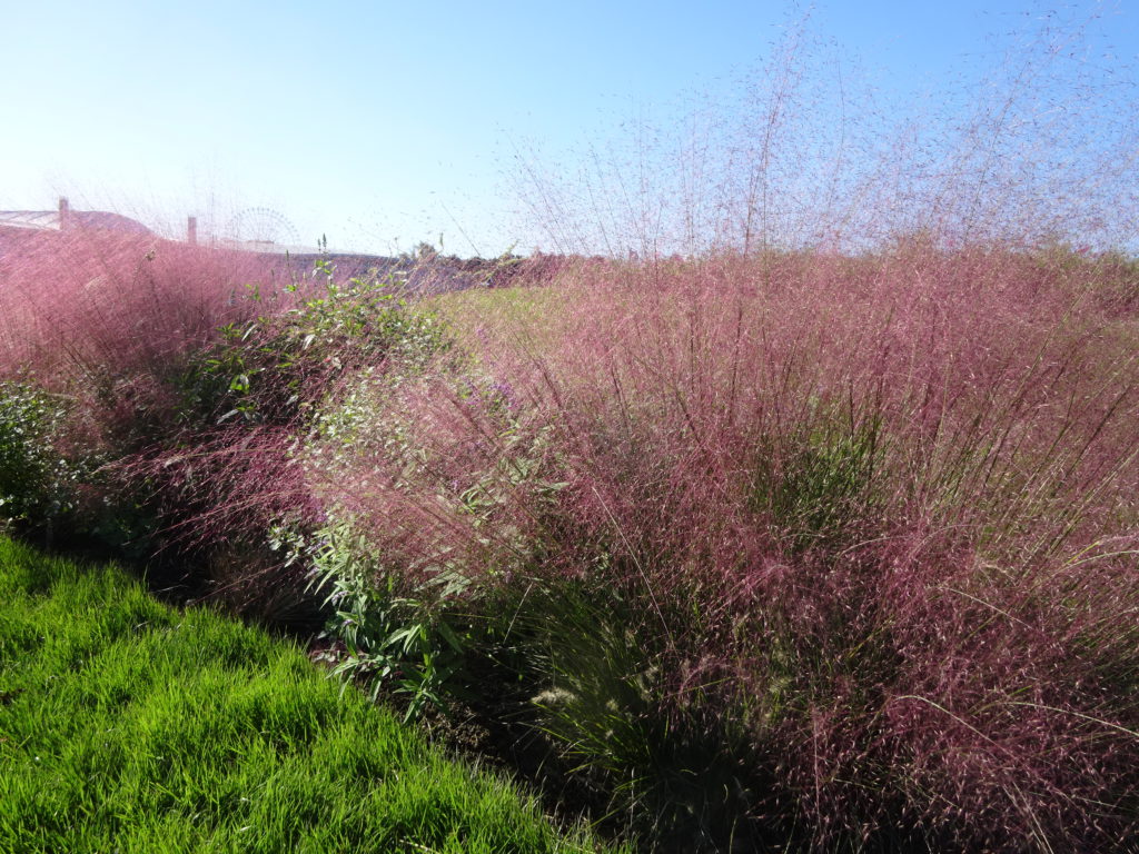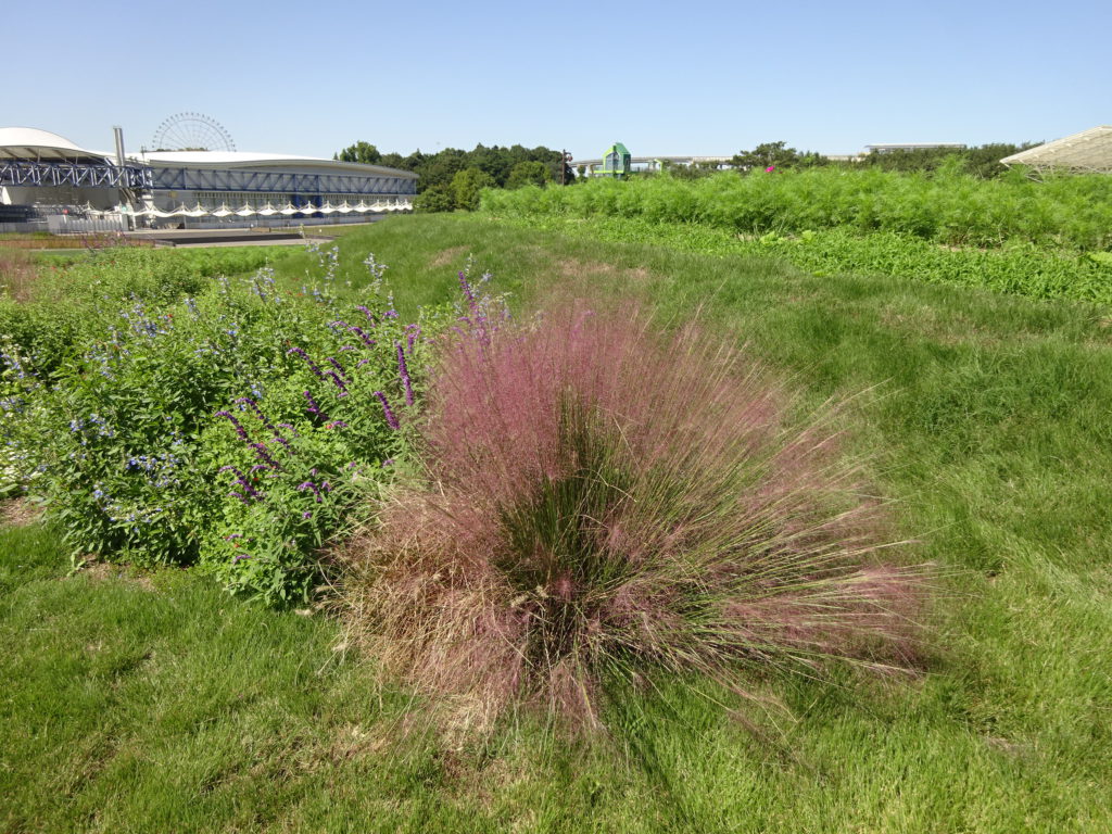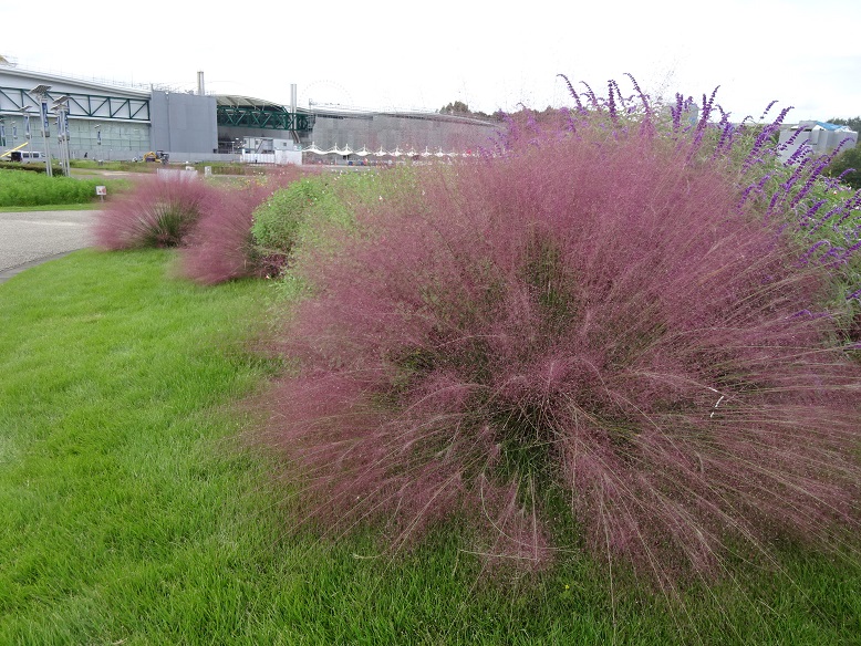 大芝生広場近くのお花畑で今年もミューリーグラスがピンク色の穂をつけています。