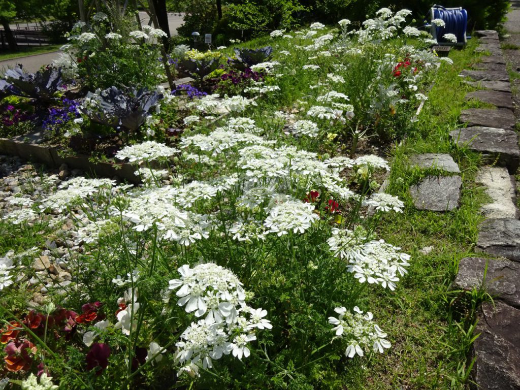大花壇で白い可憐な花を見つけました。「オルラヤ」という花だそうです。
