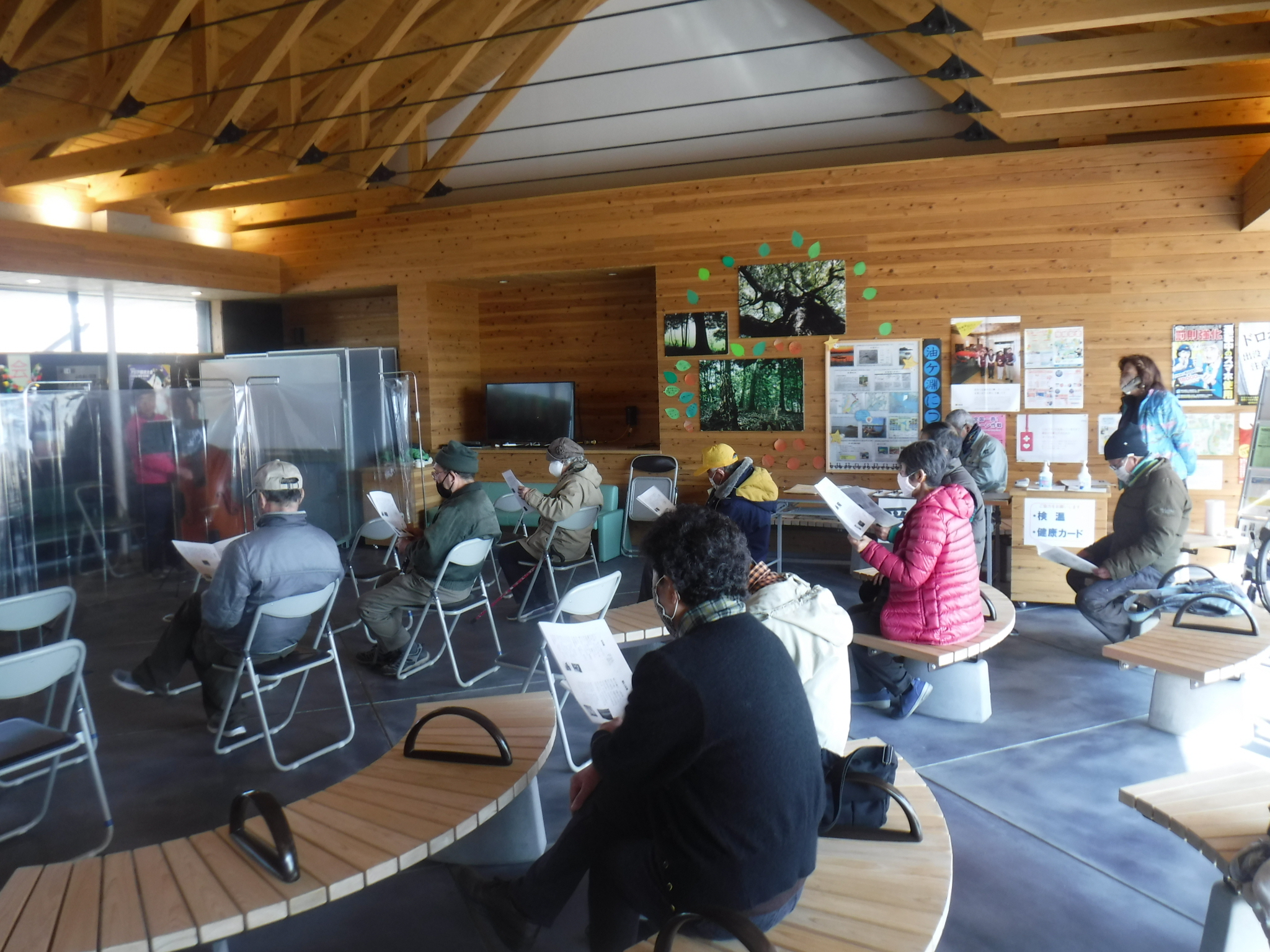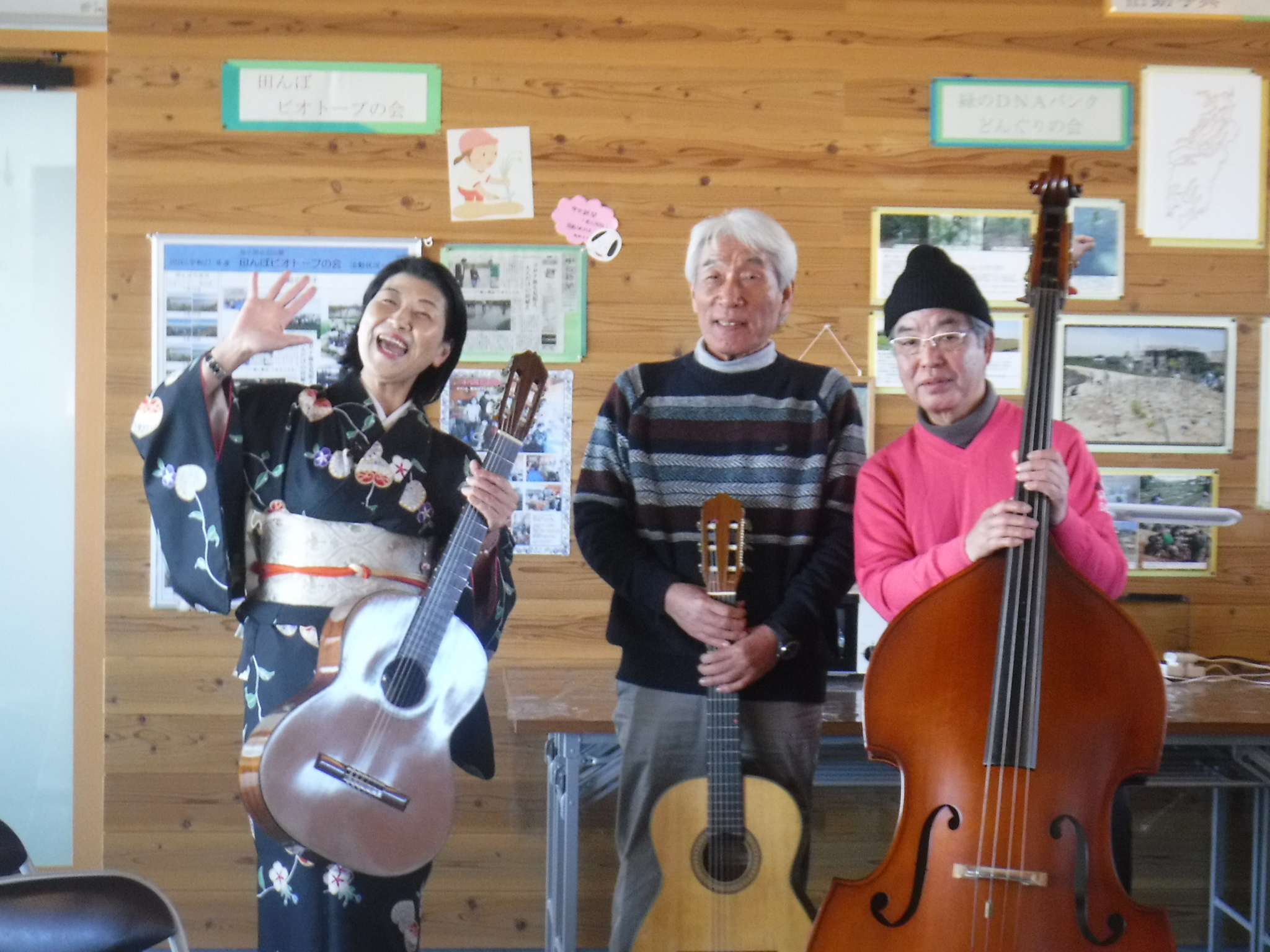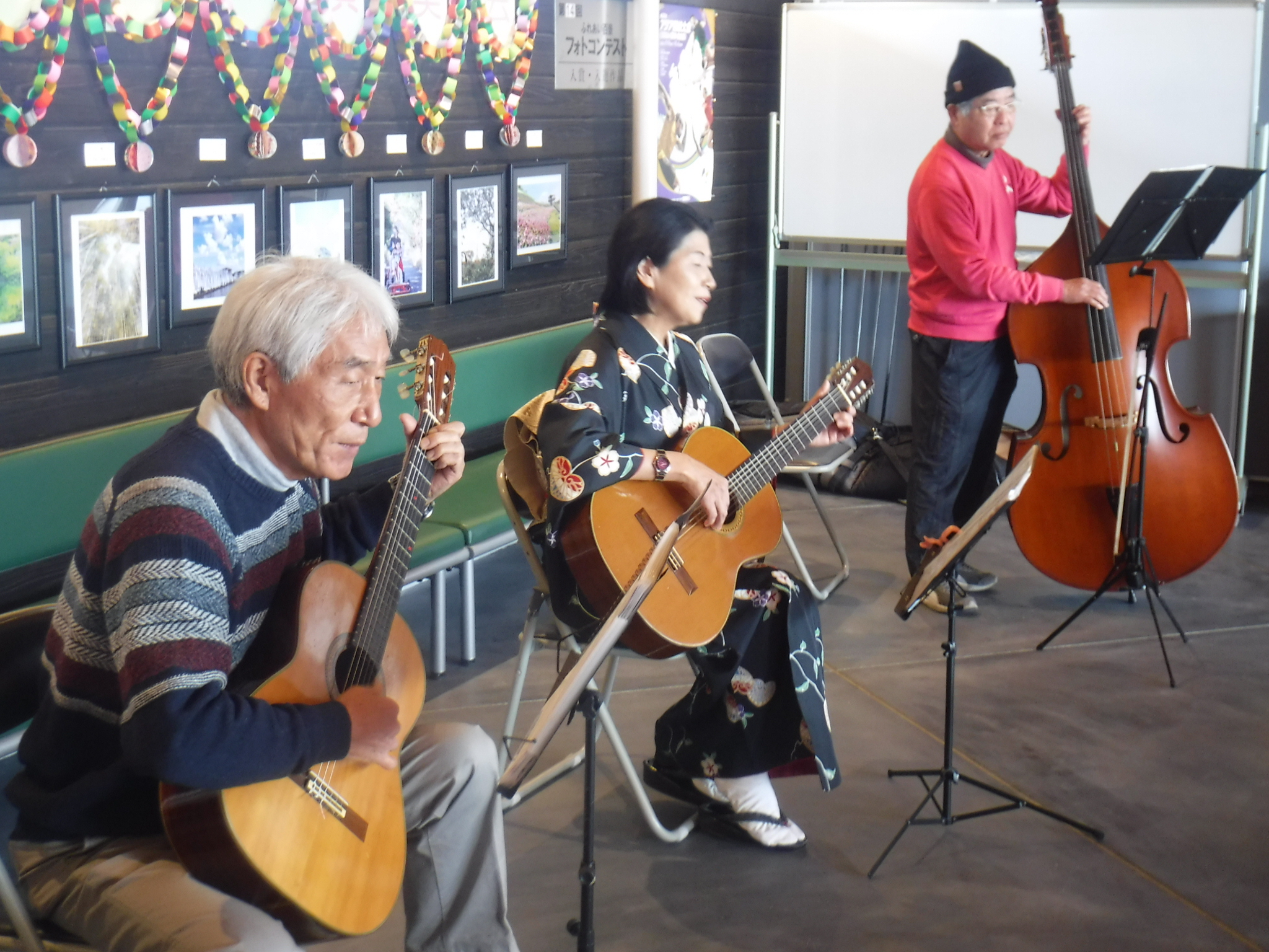 R3/1/10『なつかしい歌をくちずさみましょう!』思い出メロディー演奏会を開催しました。 更新日 2021/01/14 寒い中ご参加いただきありがとうございました。 演奏は大衆歌謡楽団ロマンスの皆さんです。休憩所にはギターとコントラバスのとても心地よい音色が響きました。 次回は春に予定しています!