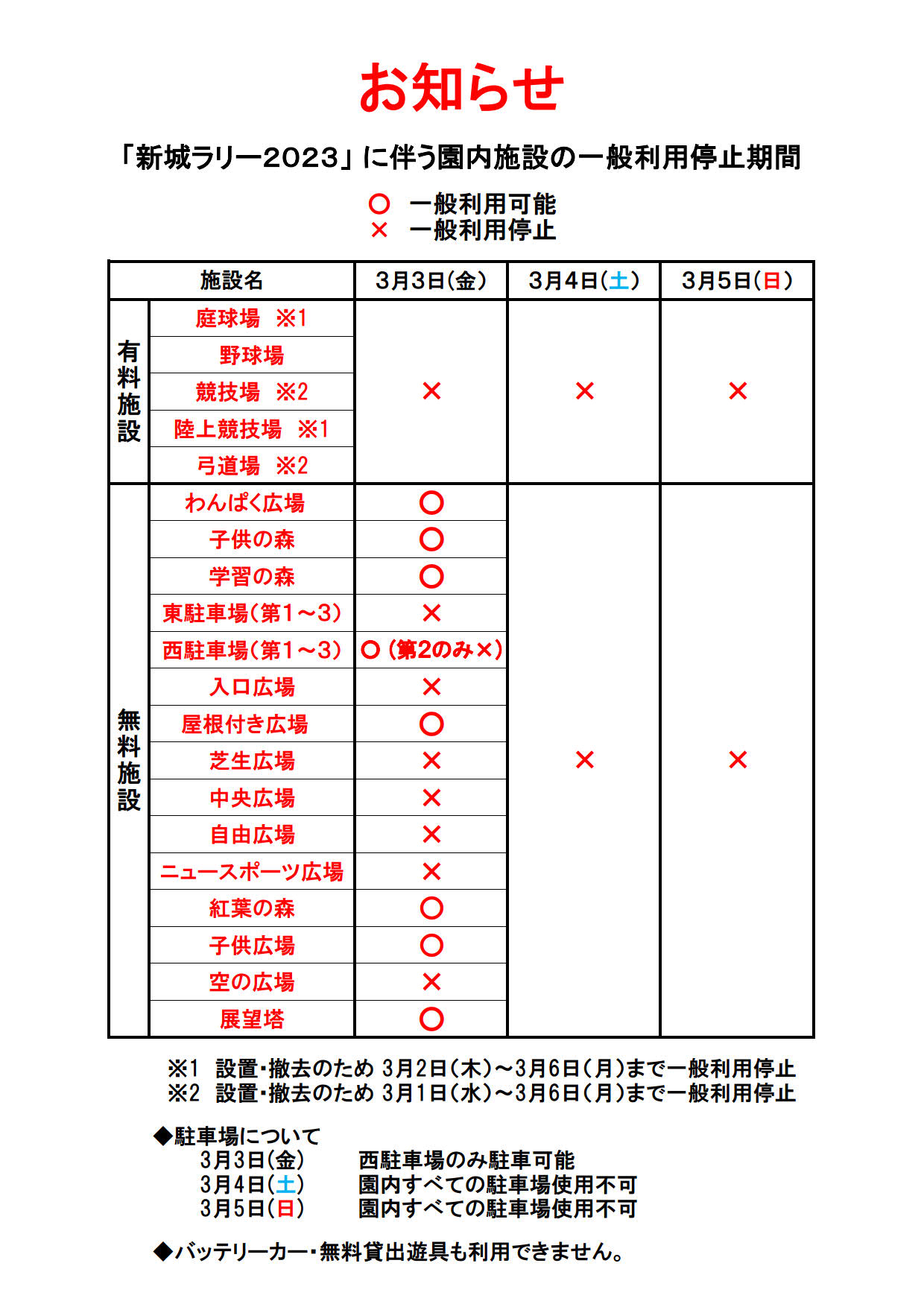 「新城ラリー2023」に伴う園内施設の一般利用停止期間について(~3/5)