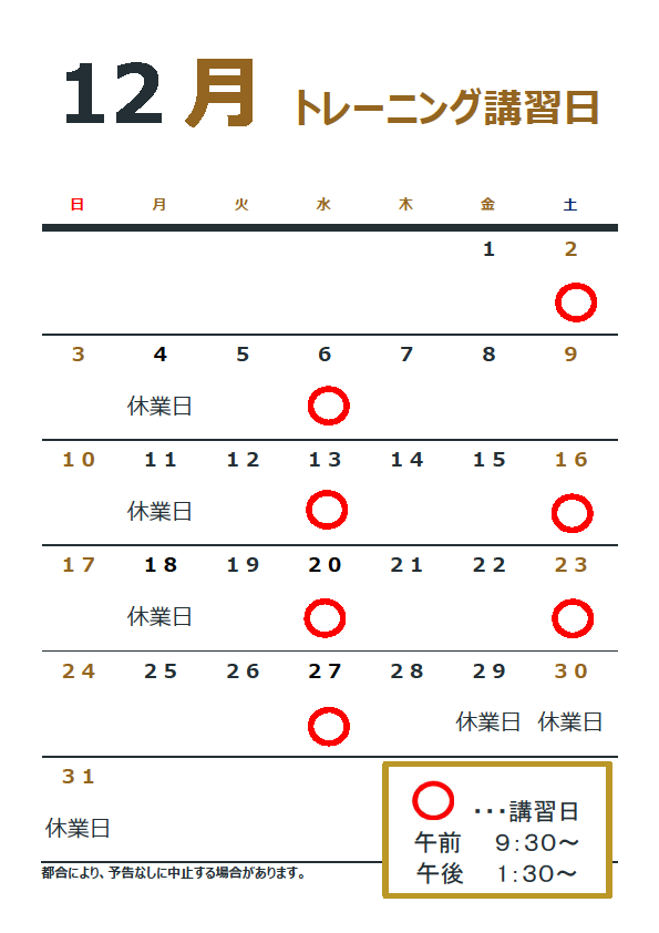 12月のトレーニング講習日は下記のとおりですp(^ ^)q