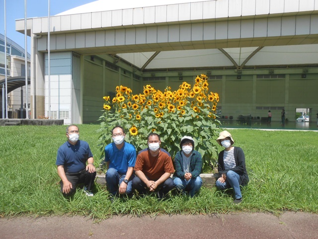 フレッシュパーク体育館前の花壇に、地域活動支援センター本庄プラザ様が植えてくれたヒマワリの種ですが、種まきから2ヶ月の間、水やりや除草を行いながら育ててきた結果、こんなに大きくなりましたので、皆様をお呼びしてヒマワリの前で記念撮影をp(^ ^)q