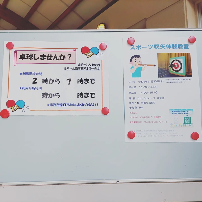 本日(12/4)も卓球できますp(^ ^)q 更新日 2022/12/04 今日の日曜日(12/4)は14:00から19:00まで体育室が空いております。ぜひフレッシュパークへお越しくださいo(^o^)o