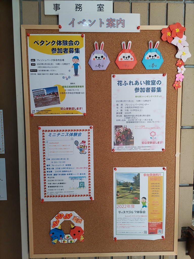 募集中のイベント案内 更新日 2023/01/22 ただいま募集中のイベントポスターを管理事務所の窓口に掲示しております(*^_^*) 興味のあるイベントがありましたら、お気軽に声を掛けてくださいねo(^o^)o