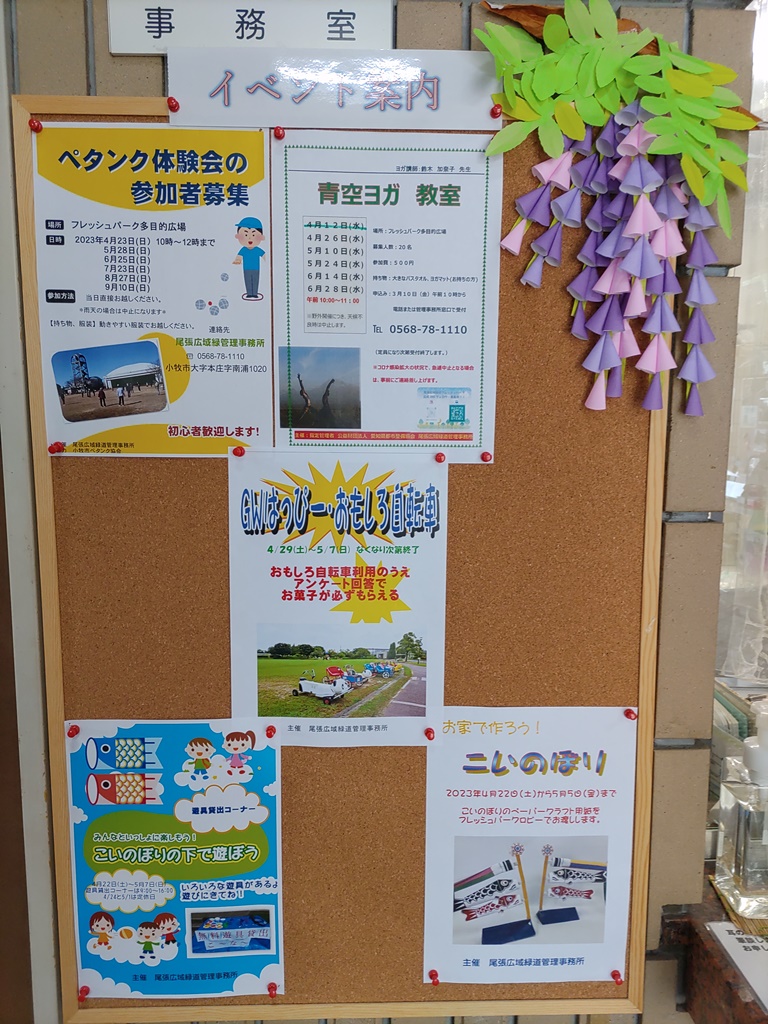 今日からゴールデンウィークとなりますので、直近のイベントポスターを管理事務所の受付カウンターと、おもしろ自転車受付前に掲示していますp(^ ^)q