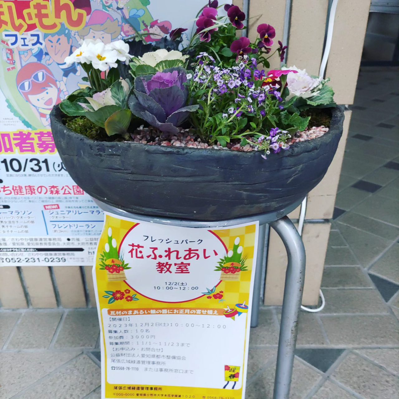 花ふれあい教室(12/2)の完成見本(*^_^*) 更新日 2023/11/12 12/2(土)に開催される「花ふれあい教室」の完成品見本をロビーの受け前に展示しましたp(^ ^)q 11/23(木・祝)までの募集となっていますので、興味のある方は、お早めに管理事務所へお問い合わせくださいo(^o^)o