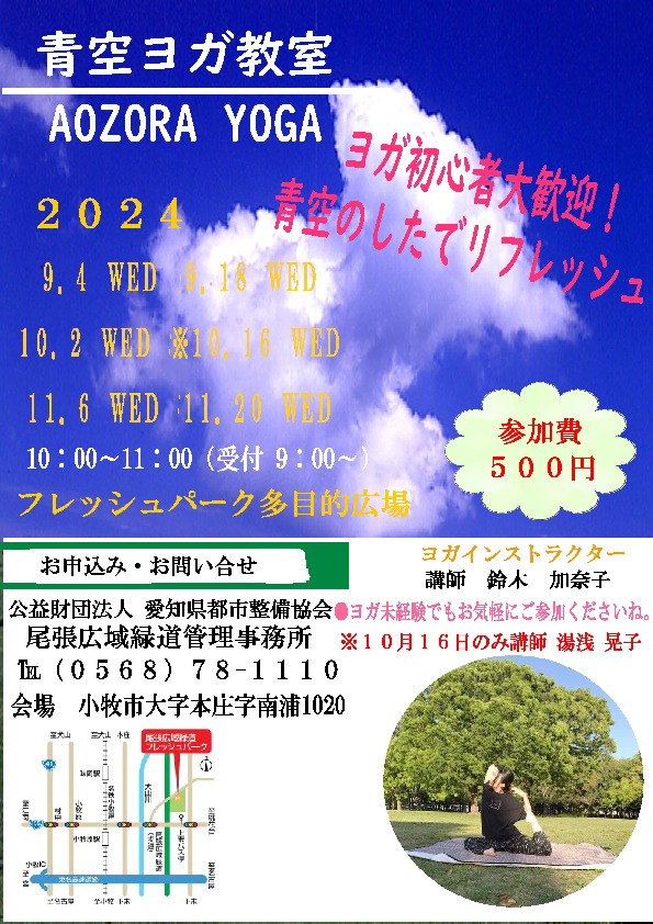本日(11/6)開催の「青空ヨガ」教室の講師は、都合により鈴木加奈子先生から湯浅晃子先生に変更させて頂きます。