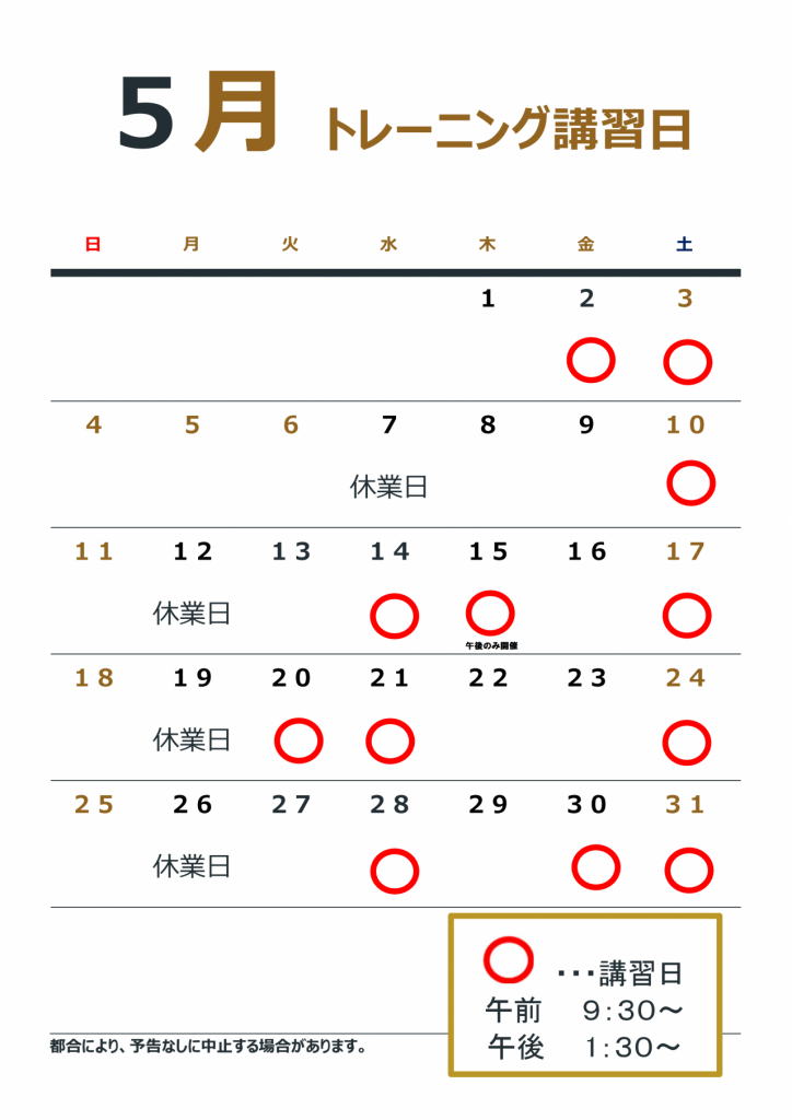 5月のトレーニング講習日ですが、都合により15日(木)は午後のみの開催とさせて頂きます。