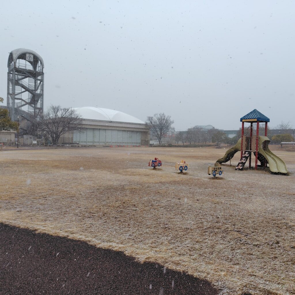 フレッシュパークは午前8時頃から雪が降り始め、薄っすらと積もってきましたので、本日(2/8)おもしろ自転車の利用はコースの安全が確認されるまで中止となります(終日中止の可能性あり)