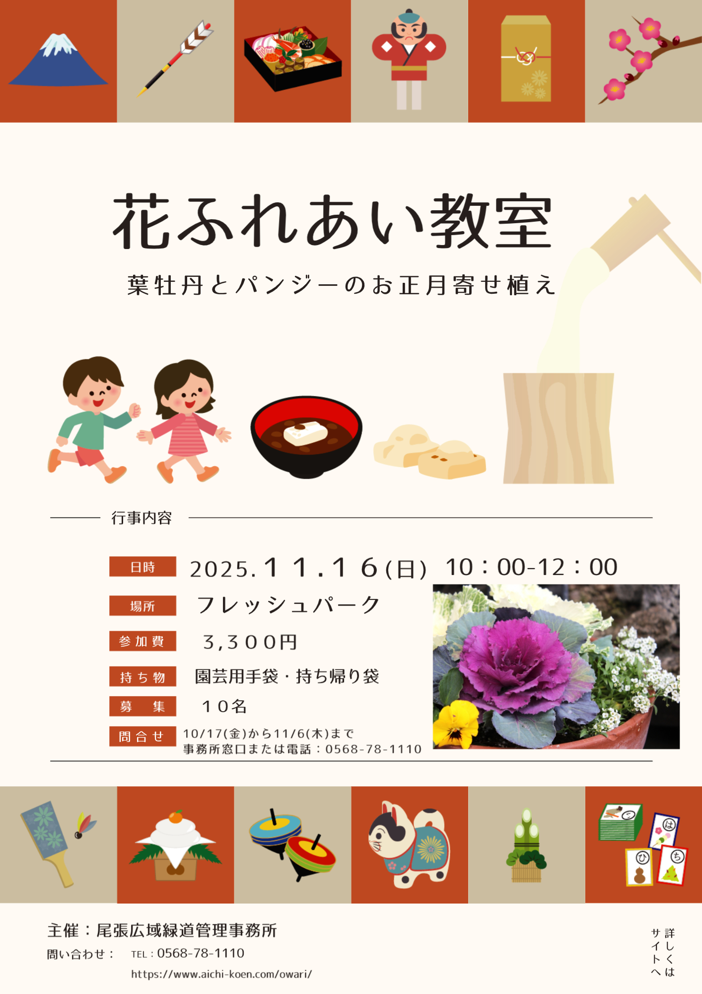11月のテーマは「葉牡丹とパンジーのお正月寄せ植え」です。