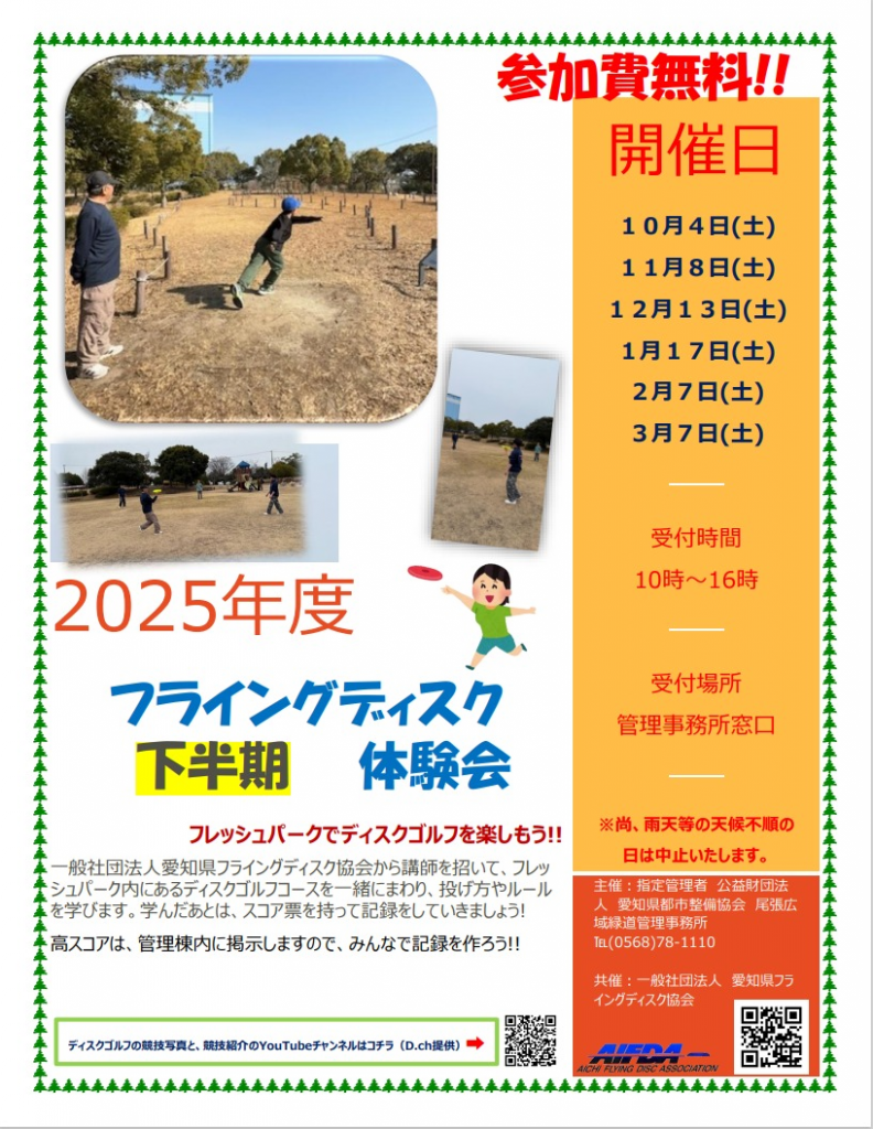 フレッシュパーク内にある、無料施設の多目的広場とディスクゴルフ場で、体験会を催します!!