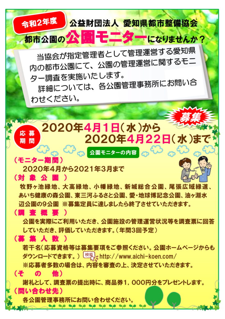 令和2年度 公園モニター募集のご案内 更新日 2020/04/09 令和2年度 公園モニター募集のご案内 2020年4月~2021年3月の公園モニターを募集いたします。 〇募集案内はこちらです。 〇公園モニター申込書はこちらです。