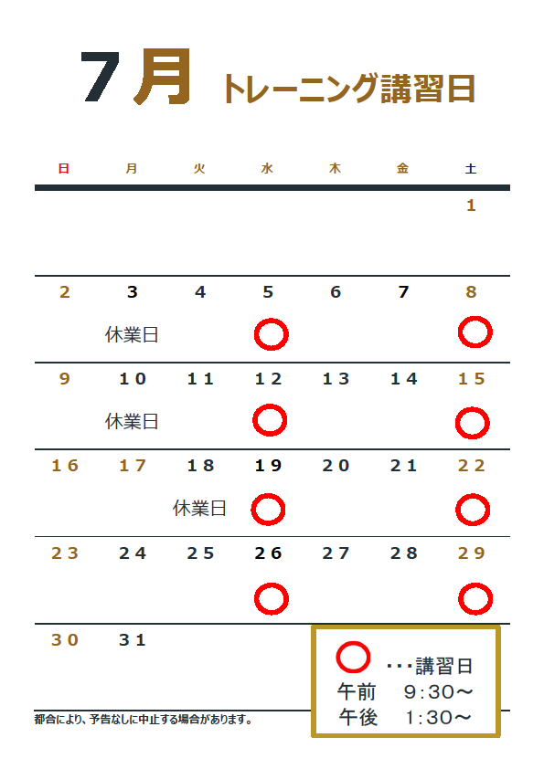 6月のトレーニング講習日は下記のとおりですp(^ ^)q