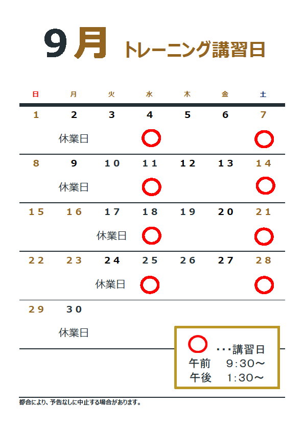 9月のトレーニング講習日 更新日 2024/08/22 9月のトレーニング講習日は下記のとおりですp(^ ^)q トレーニング講習では初めての方にも丁寧な指導を致しますので、皆様のお越しをお待ちしております(^_^)/^^^ ※トレーニング室が利用できるのは高校生以上の方となります