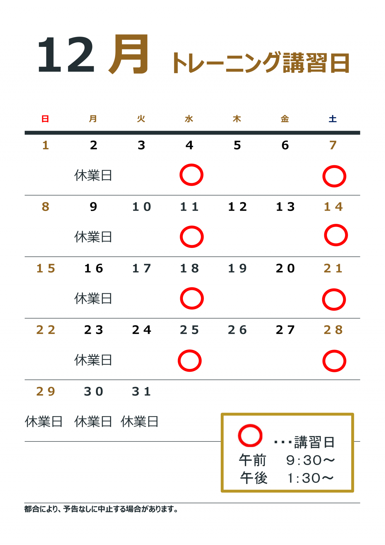 12月のトレーニング講習日 更新日 2024/11/27 12月のトレーニング講習日は下記のとおりですp(^ ^)q トレーニング講習では初めての方にも丁寧な指導を致しますので、皆様のお越しをお待ちしております(^_^)/^^^ ※トレーニング室が利用できるのは高校生以上の方となります