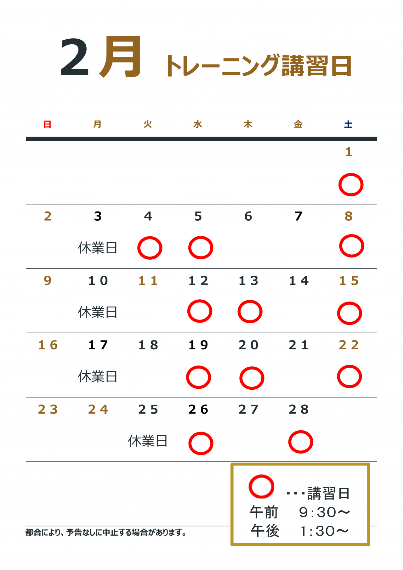 2月のトレーニング講習日 更新日 2025/01/22 2月のトレーニング講習日は下記のとおりですp(^ ^)q トレーニング講習では初めての方にも丁寧な指導を致しますので、皆様のお越しをお待ちしております(^_^)/^^^ ※トレーニング室が利用できるのは高校生以上の方となります