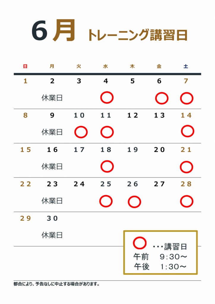 6月のトレーニング講習日は下記のとおりですp(^ ^)q