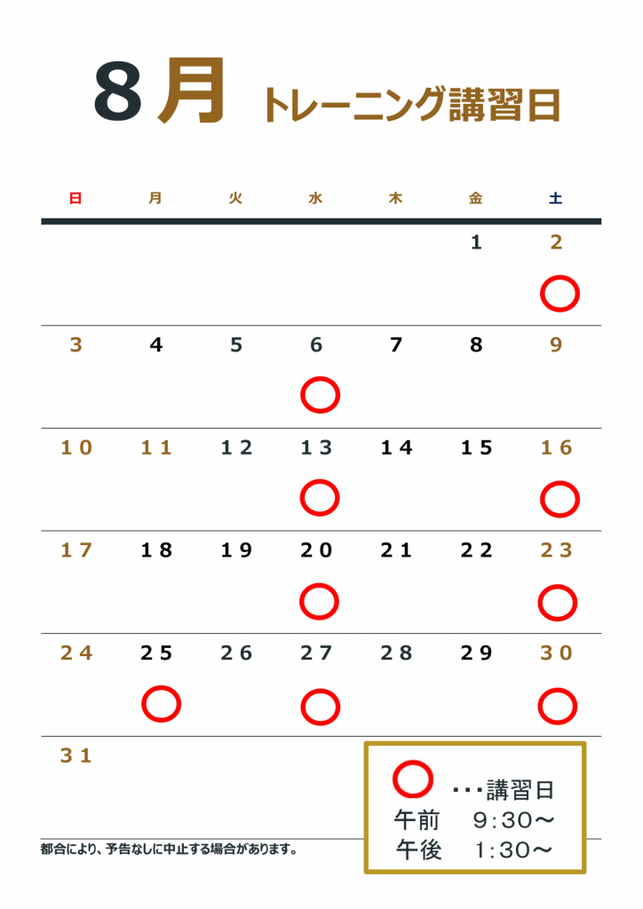 8月のトレーニング講習日は下記のとおりですp(^ ^)q