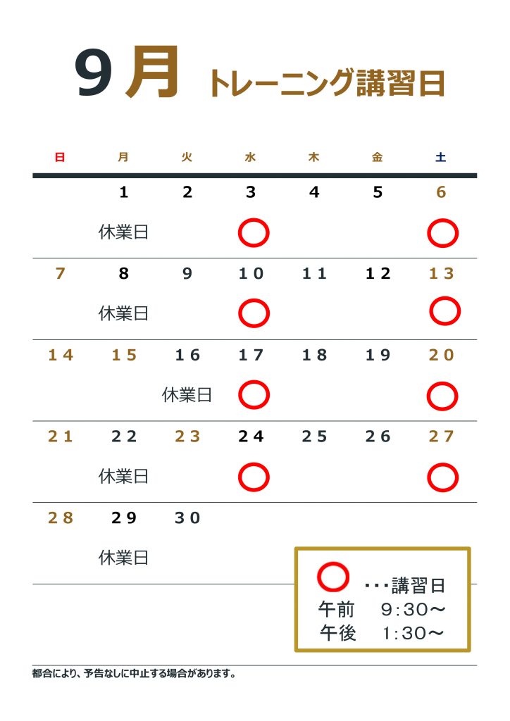 9月のトレーニング講習日は下記のとおりですp(^ ^)q