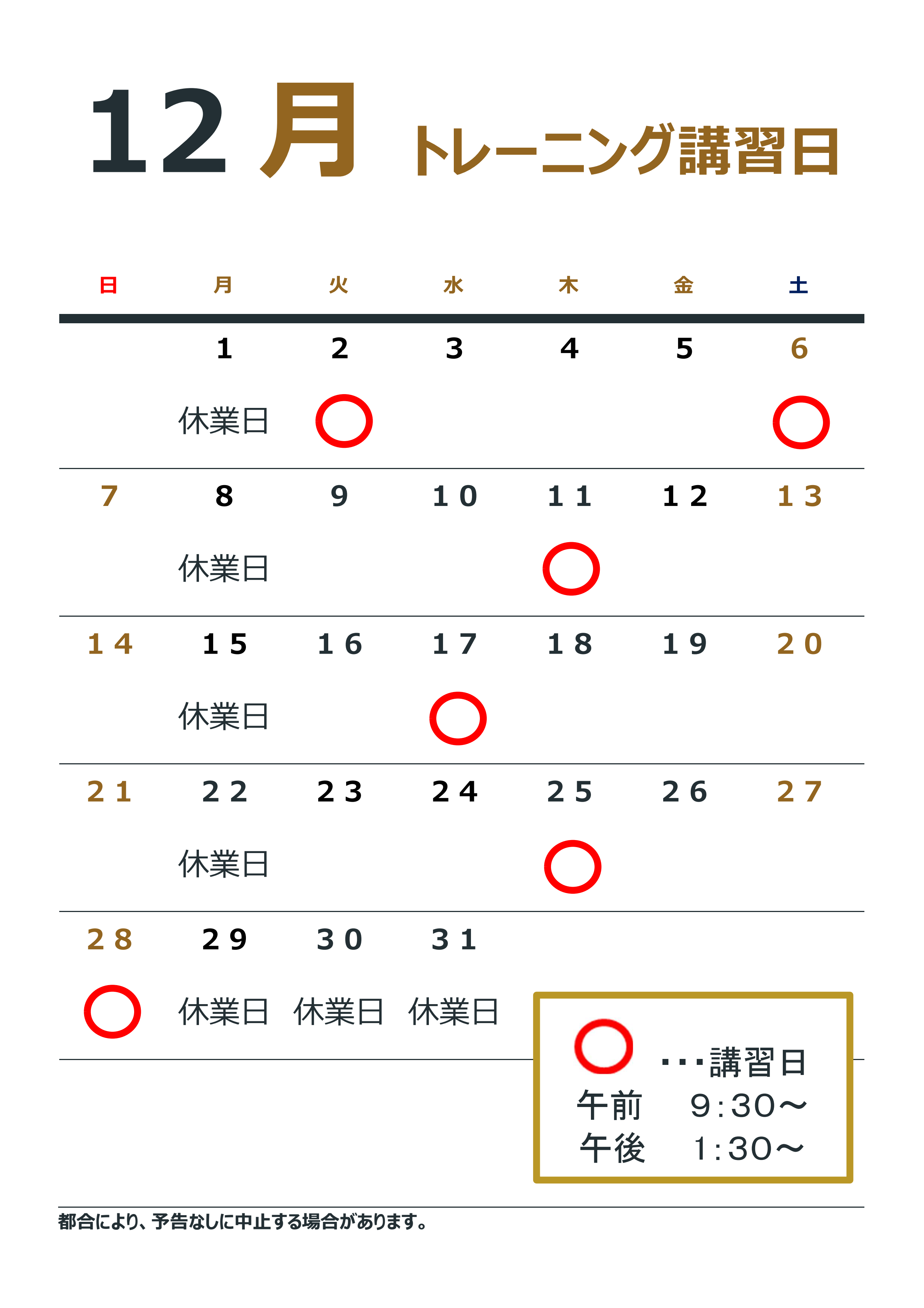 12月のトレーニング講習日は下記のとおりですp(^ ^)q