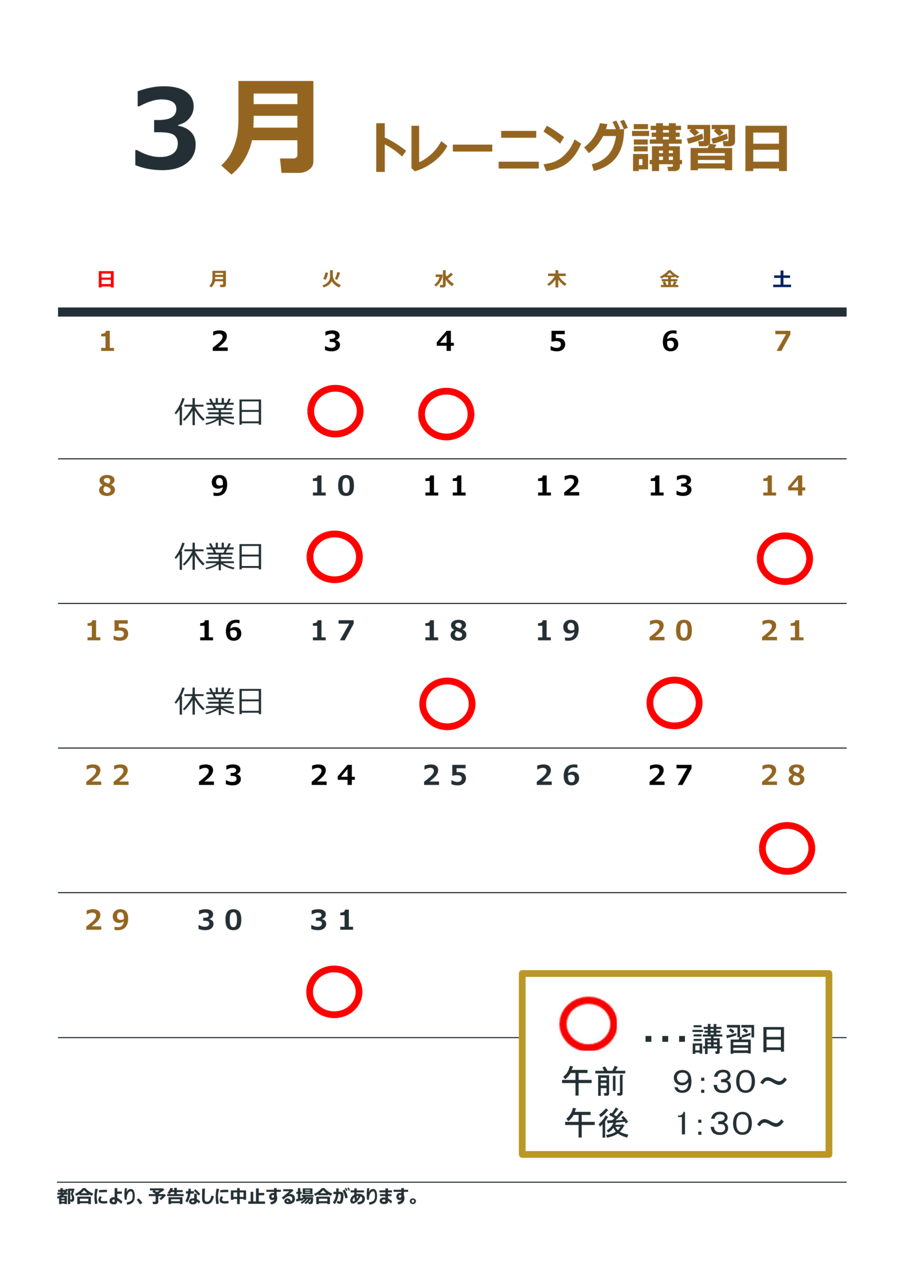 3月のトレーニング講習日は下記のとおりですp(^ ^)q